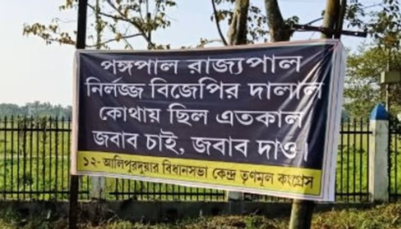 ঘটনাটি ঠিক কী? ঘড়িতে তখন সকাল ৭টা বেজে ৩৪ মিনিট। শুক্রবার সাতসকালে সস্ত্রীক শিলিগুড়ির বাগডোগরা বিমানবন্দরে পৌঁছন রাজ্যপাল জগদীপ ধনখড়। বিমানবন্দর থেকে সোজা আলিপুরদুয়ার। সড়কপথে যখন লাদাখে শহিদ বিপুল রায়ে বাড়িতে যাচ্ছেন রাজ্যের সাংবিধানিক প্রধান, তখন রাস্তার পাশে নজরে পড়ে 'রাজ্যপাল পঙ্গপাল' লেখা একটি পোস্টার। রাজ্যপালের যাত্রাপথে কারা এমন পোস্টার টাঙালো? পোস্টারের নিচে লেখা, 'আলিপুরদুয়ার বিধানসভাকেন্দ্র তৃণমূল কংগ্রেস'। কোনও প্রতিক্রিয়া না দিলেও, এমন ঘটনায় রাজ্যপাল যারপরনাই ক্ষুদ্ধ হয়েছেন বলে জানা গিয়েছে। এদিকে আবার পোস্টারের সঙ্গে তাদের কোনও সম্পর্ক নেই বলে দাবি করেছে তৃণমূল কংগ্রেসের স্থানীয় নেতৃত্ব।