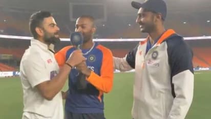 বিসিসিআই শেয়ার করা ভিডিওতে দেখা যাচ্ছে, ম্যাচের সেরা’ অক্ষরের সঙ্গে কথা বললেন টিম ইন্ডিয়ার আর এক অলরাউন্ডার হার্দিক পাণ্ড্য। মজার এই সাক্ষাৎকারের শেষে আরও মজার ককটেল যোগ করলেন অধিনায়ক বিরাট কোহালি। ২ জনের কথোপকথনের মাঝে ঢুকে হঠাৎ বলে দিলেন, “এ বাপু তারি বোলিং কামাল ছে!” বিরাটের গুজরাটি ভাষা শুনে হাসিতে ফেটে পড়েন হার্দিক ও অক্ষর। নেটিজেনদেরও মনে ধরেছে তিন ভারতীয় তারকার মজাদার ভিডিও।