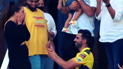 মাঠে দিনটা খুবই খারাপ গেলেও, বৃহস্পতিবার ম্যাচ শেষে গ্যালারি মাতিয়ে দেন সিএসকে-র জোরে বোলার। ম্যাচের শেষে সোজা গ্যালারিতে চলে যান দীপক। তারপর হাঁটু মুড়ে বসে আঙটি তুলে ধরেন প্রেমিকা জয়া ভরদ্বাজের সামনে।