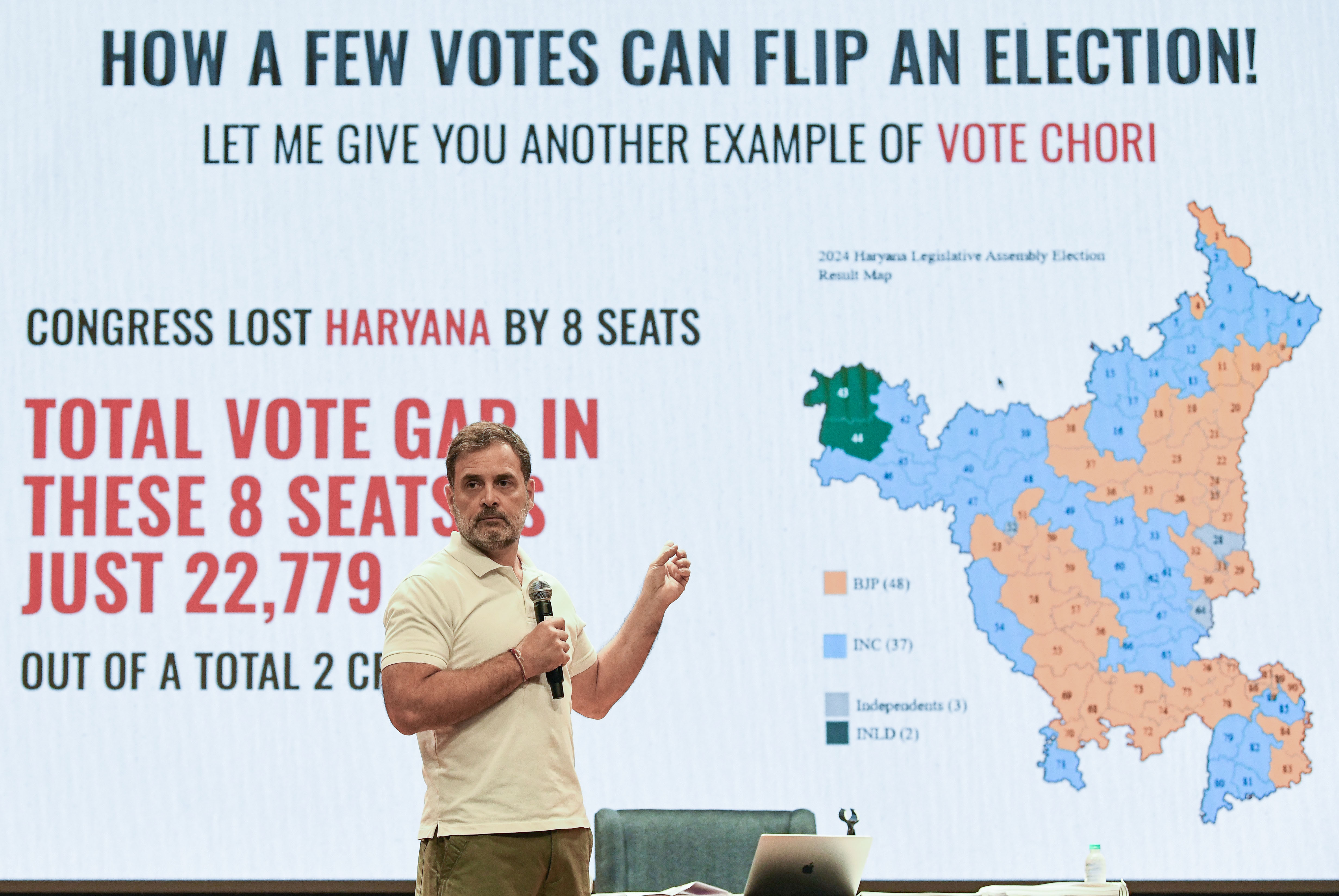অভ্যন্তরীণ বিশ্লেষণ উদ্ধৃত করে গান্ধী বলেছিলেন যে কংগ্রেস কর্ণাটকে ১৬টি আসন জয়ের আশা করেছিল কিন্তু শেষ পর্যন্ত মাত্র নয়টি পেয়েছে। তিনি বলেছিলেন যে কংগ্রেস সাতটি অপ্রত্যাশিত পরাজয়ের তদন্ত করেছে, মহাদেবপুরার উপর জিরো করেছে, যেখানে তিনি ১,০০,২৫০ ভোট জড়িত ভোট চুরির অভিযোগ করেছিলেন।