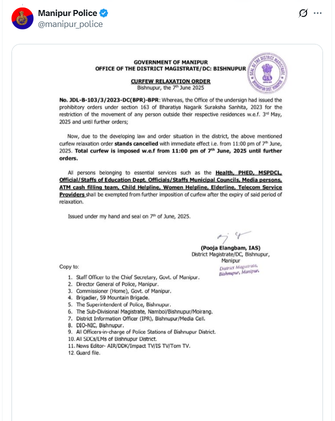 এদিকে, বিষ্ণুপুর জেলায় ৭ জুন, ২০২৫ তারিখ রাত ১১:০০ টা থেকে পরবর্তী আদেশ না দেওয়া পর্যন্ত সম্পূর্ণ কারফিউ জারি করা হয়েছে। আইনশৃঙ্খলা পরিস্থিতির অবনতির কারণে পূর্বে জারি করা কারফিউ শিথিল করার আদেশ বাতিল করা হয়েছে।