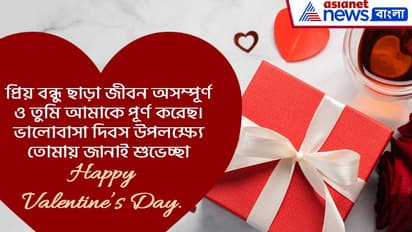 প্রিয় বন্ধু ছাড়া জীবন অসম্পূর্ণ ও তুমি আমাকে পূর্ণ করেছ। ভালোবাসা দিবস উপলক্ষ্যে তোমায় জানাই শুভেচ্ছা। Happy Valentine’s Day. – আপনার মনের মানুষ যদি আপনার ভালোবাসার মানুষ হয় তাহলে এভাবে প্রকাশ করুন আপনার ভালোবাসা। দিনের শুরুতে পাঠাতে পারেন এই বার্তা।