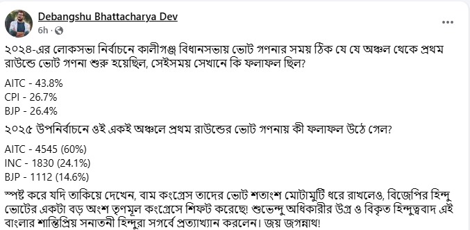 দেবাংশুর দেওয়া তথ্য অনুযায়ী ২০২৪ সালে কালীগঞ্জ বিধানসভা কেন্দ্রে তৃণমূলে প্রাপ্ত ভোট ছিল ৪৩.৮ শতাংশ। আর সোমবার উপনির্বাচনের ফল প্রকাশ হওয়ার সময় কয়েক রাউন্ড গণনা শেষে দেখা গেল সেই ভোটের হাত ৬০ শতাংশে উঠে গেছে। তুলনায় বিজেপির ভোট প্রাপ্তির হার কমেছে অনেকটা। বাম - কংগ্রেসের ক্ষেত্রে এই পরিসংখ্যানে তেম একটা হেরহেফ হয়নি। দেবাংশুর ব্যাখ্যা বিজেপির হিন্দু-ভোটেকরক অনেকটাই তৃণমূলের ঝুলিতে এসেছে।