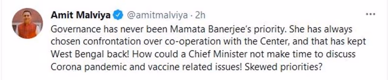 বিজেপি-র আইটি সেলের প্রধান তথা পশ্চিমবঙ্গের পর্যবেক্ষক অমিত মালব্য এই বিষয়ে টুইট করে বলেছেন, 'সরকার পরিচালনা কখনই মমতা বন্দ্যোপাধ্যায়ের অগ্রাধিকার নয়। কেন্দ্রের সহযোগিতা নেওয়ার জায়গায় তিনি সবসময়ই দ্বন্দ্বে যাওয়াকে বেছে নিয়েছেন এবং এটাই পশ্চিমবঙ্গকে পিছিয়ে রেখেছে। কীভাবে কোনও মুখ্যমন্ত্রী করোনা মহামারি এবং ভ্যাকসিন সম্পর্কিত সমস্যাগুলি নিয়ে আলোচনায় সময় দিতে পারেন না! অগ্রাধিকার কোনটা বোঝেন না?'