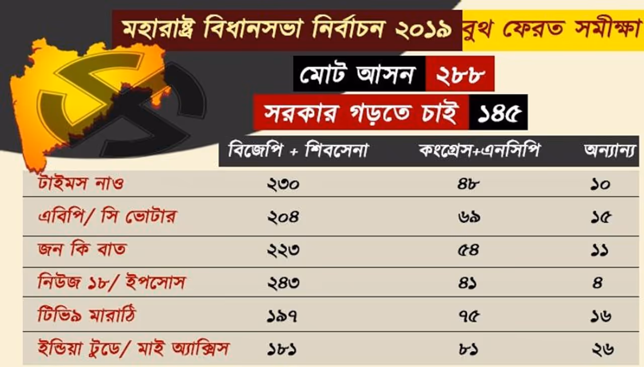 মহারাষ্ট্রে, টাইমস নাও, এবিপি/ সি ভোটার, জন কি বাত, নিউজ ১৮/ ইপসোস, টিভি৯ মারাঠি, ইন্ডিয়া টুডে/ মাই অ্যাক্সিস বুথ ফেরত সমীক্ষা চালিয়েছে, তাতে দেখা যাচ্ছে অধিকাংশ সংস্থারই সমীক্ষার ফল বলছে মহারাষ্ট্রে চাইলে এককভাবেই সরকার গড়তে পারবে বিজেপি। গত বিধানসভা ভোটে ১২২টি আসন জিতেছিল বিজেপি। এবার নিশ্চিতভাবেই তাদের আসন সংখ্যা অনেকটাই বাড়তে চলেছে। একইভাবে গতবার ৬৩ আসনে আটকে যাওয়া শিবসেনা এইবার ১০০ আসনের গন্ডি পার করবে বলে মনে করা হচ্ছে। এই জোটের ঝুলিতে ১৮১ থেকে ২৩০টি আসন আসতে পারে।