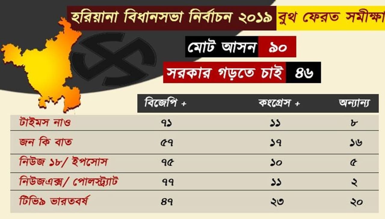অন্যদিকে হরিয়ানায় এইবার বিজেপি কর্মীদের আসন সংখ্যা ৪৭ থেকে বাড়িয়ে ৭৫-এ নিয়ে যাওয়ার চ্যালেঞ্জ দিয়েছিলেন মুখ্যমন্ত্রী মনোরলাল খট্টর। নিশ্চিন্তেই সেই লক্ষ্য পূরণ হতে পারে বলে আভাস মিলেছে বুথ ফেরত সমীক্ষায়। টাইমস নাও, জন কি বাত, নিউজ ১৮/ ইপসোস, নিউজএক্স/ পোলস্ট্র্যাট ও টিভি৯ ভারতবর্ষ-এর বুথ ফেরত সমীক্ষার মধ্যে নিউজ ১৮/ ইপসোস, ও নিউজএক্স/ পোলস্ট্র্যাট বিজেপি ৭৫টির বেশি আসন পেতে পারে বলে জানিয়েছে। অপরদিকে কংগ্রেসের রক্তক্ষরণ এই রাজ্যেও অব্যাহত থাকবে বলে মনে করা হচ্ছে। বুথ ফেরত সমীক্ষার অধিকাংশই তাদের ঝুলিতে ১০ থেকে ১১টি আসনের বেশি দিতে পারেনি। গত বছরের ১৫টি আসন ধরে রাখাও তাদের পক্ষে কঠিন হতে পারে। অপর পক্ষ ভারতের রাষ্ট্রীয় লোকদল ২০১৪ সালে ১৯টি আসন পেয়েছিল। এইবার তারা ধুয়ে মুছে যেতে পারে বলে আভাস মিলেছে। ওমপ্রকাশ চৌটালার বদলে তাঁর ত্যায্য পুত্রের জেজেপি দল ভাল ফল করতে পারে বলে মনে করা হচ্ছে।