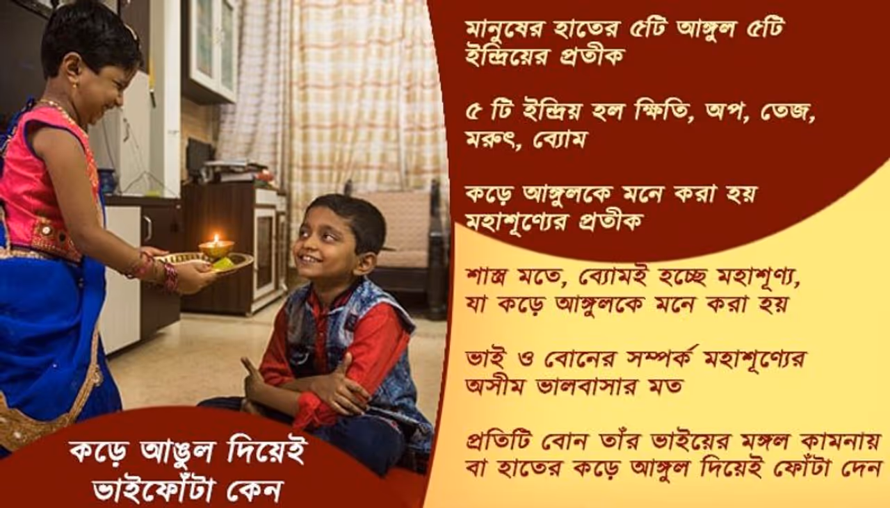 শাস্ত্র মতে ভাই ও বোনের সম্পর্ক মহাশূণ্যের অসীম ভালবাসার মত। সেই কারণের প্রতিটি বোন তাঁর ভাই বা দাদার মঙ্গল কামনায় বা হাতের কড়ে আঙ্গুল দিয়েই ফোঁটা দেন। তিথি মেনে দ্বিতীয়াতে ভাইয়ের মঙ্গল কামনার উদ্দেশ্যে উপবাস থেকে ফোঁটা দেন।