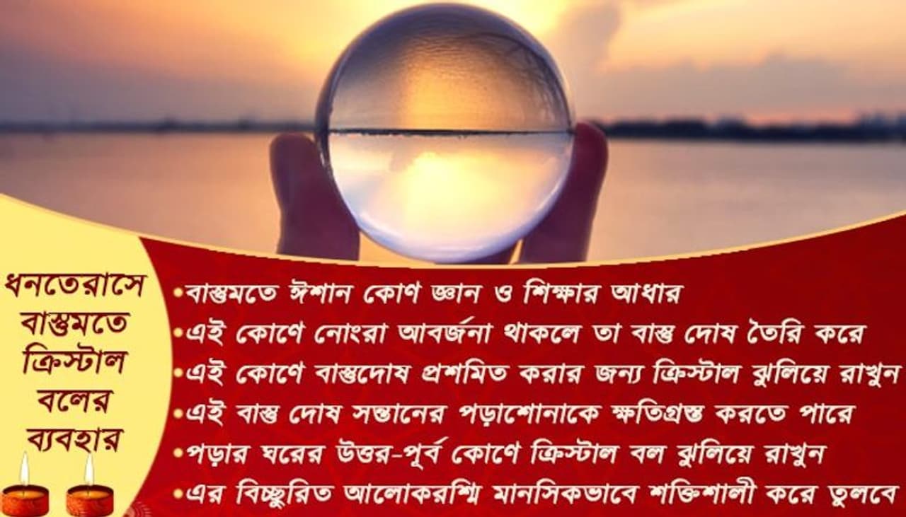 আমাদের প্রত্যেকেই কিছু না কিছু সমস্যার সম্মুখিন হতে হয় প্রত্যেকটি মানুষের জীবনেই রয়েছে নানান সমস্যা সাফ্যলের পথে বাধার সৃষ্টি করে জীবন দুর্বিসহ করে তোলে ধনতেরাসে বাস্তুশাস্ত্র মেনে ক্রিস্টাল বল ব্যবহার করে কাটিয়ে উঠুন সমস্যা