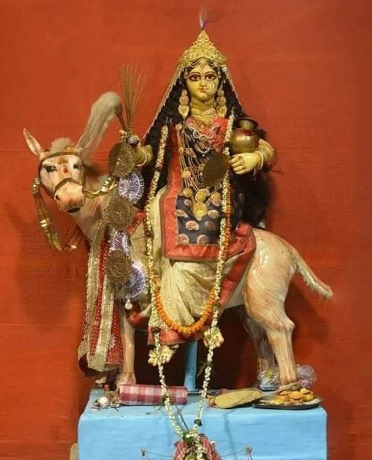 গাধার পিঠে চড়ে ঝাঁটা ও কলস হাতে নিয়ে আবির্ভূতা হন মা শীতলা।