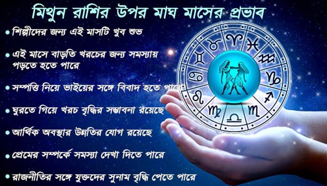 আবার মাঘ বাংলা মাসের দশম মাস। এই মাসের আরেক নাম মাঘা। মাঘ বাংলা সনের দশম মাস এবং ভারতীয় রাষ্ট্রীয় শকাব্দের একাদশ মাস। বাংলা মাঘ এবং শকাব্দের "মাঘা" নামটি এসেছে মঘা নক্ষত্রে সূর্যের অবস্থান থেকে। পাশাপাশি রাশিচক্রের তৃতীয় রাশি মিথুন। এই রাশির অধিকর্তা গ্রহ বুধ। এরা সময় বিশেষ কৃপণ আবার কখনও উদার মানসিকতার। এরা কাজ করতে খুব পছন্দ করে। এরা চঞ্চল এবং অস্থির মানসিকতার। এরা অত্যন্ত তোষামোদ প্রিয়। এরা কোন কাজ করবে কোন কাজ করবে না তা এরা সিদ্ধান্ত নিতে পারে না। তবে জেনে নেওয়া যাক মাঘ মাস মিথুন রাশির উপর কেমন প্রভাব ফেলবে-