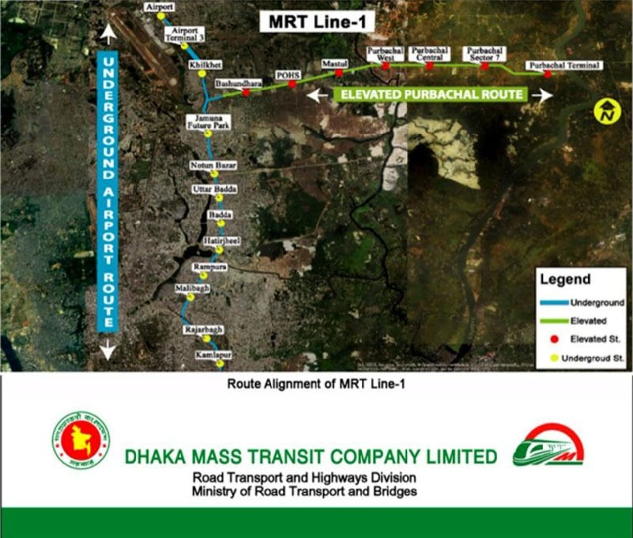 ঢাকা মাস ট্রান্জিট কোম্পানি-র দেওয়া তথ্য থেকে যা জানা যাচ্ছে, তাতে দেখা যাচ্ছে, মাটির নিচে মেট্রোরেল করার প্রথম ধাপে এমআরটি লাইন ১-এর কাজে হাত দিচ্ছে তারা। এই মেট্রোরেল রুটের মোট দৈর্ঘ ৩১.২৪১ কিলোমিটার। এই মেট্রোরেল রুট আবার দুইভাগে বিভক্ত। একটি রুট ঢাকা এয়ারপোর্ট থেকে কমলাপুর, যা বিমানবন্দর রুট নামে পরিচিত এবং অন্য রুটটি হল পূর্বাচল-যেখানে মেট্রো রেলের সংযোগ থাকবে নতুনবাজার থেকে পিতলগঞ্জ ডিপো পর্যন্ত।