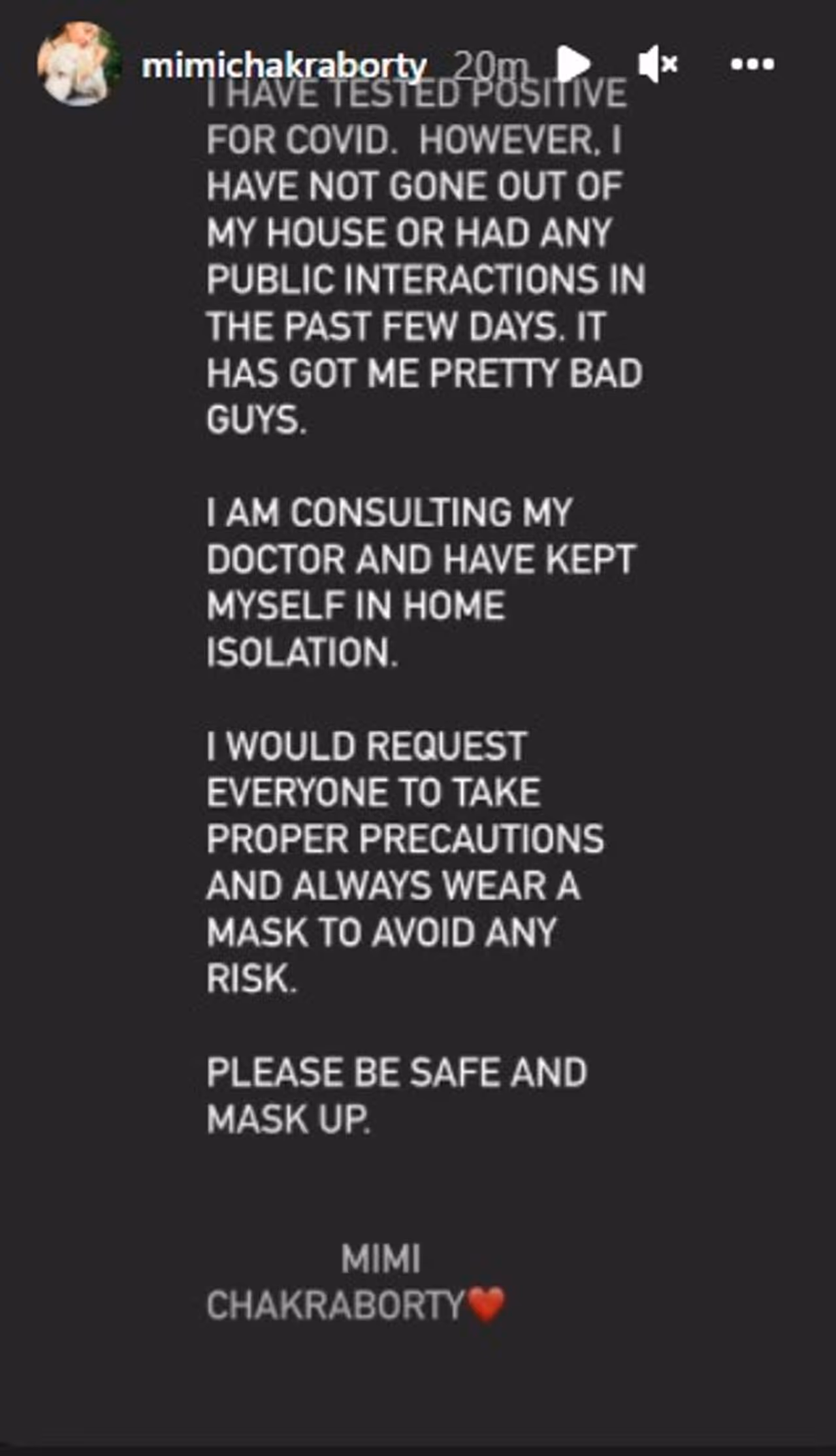 এবার আক্রান্তের খবর শেয়ার করলেন মিমি চক্রবর্তী। করোনায় আক্রান্ত হওয়ার খবর জানিয়ে তিনি ইনস্টা স্টোরিতে লেখেন, তিনি করোনা পজিটিভ, যদিও শেষ কয়েকদিন তিনি বাড়ির বাইরে যাননি।