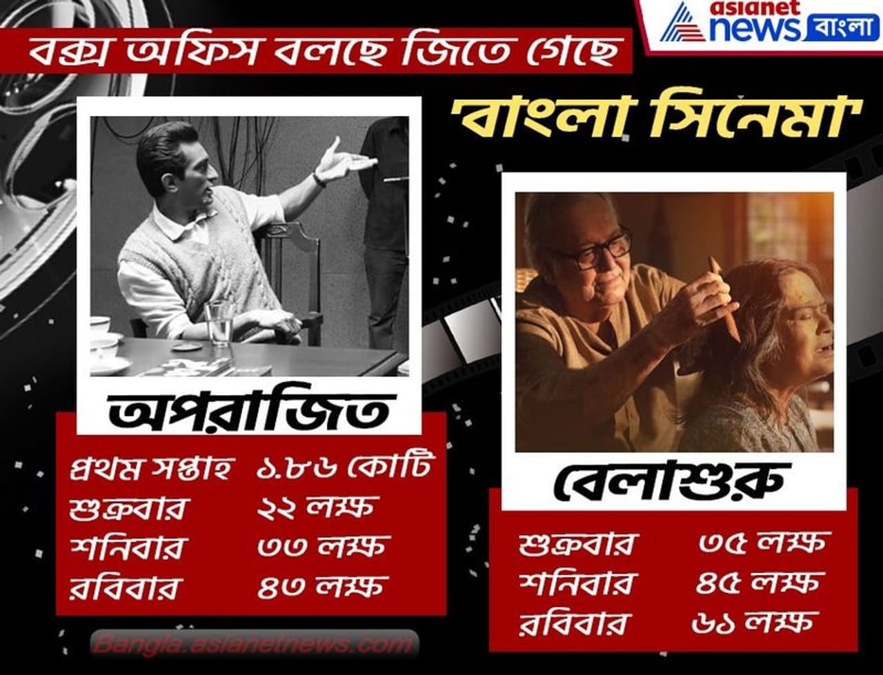 একদিকে দক্ষিণী সিনেমার দাপটে যেখানে চিন্তায় বলিউড সেখানে এই দুই ছবির বাঁধনছাড়া সাফল্য নজর কেড়েছে সকলের। প্রথম সপ্তাহেই আগের ছবিগুলির রেকর্ড ভেঙে দিয়েছে শিবপ্রসাদ মুখোপাধ্যায় এবং নন্দিতা রায়ের এই ছবি বেলাশুরু। পয়লা সপ্তাহান্তে ব্যবসা পেয়েছে ১ কোটির ওপর। তবে ভাঙা যায় নি অনীক দত্তের অপরাজিত- র রেকর্ড। কারণ প্রথম সপ্তাহান্তে অপরাজিত- র মোট আয় ছিল ১.৮৬ কোটি টাকা। অতিমারি পরবর্তী সময়ে বেশ কিছু বাংলা ছবিই ভালো ফল করে যেমন, কাকাবাবুর প্র্রত্যাবর্তন, টনিক। সম্প্রতি দেব-রুক্মিণী অভিনীত কিশমিশ এবং জিৎ অভিনীত রাবণ ও খুবই ভাল ফল করেছে। তবে পয়লা সপ্তাহান্তের নীরিখে অপরাজিত, বেলাশুরুর আয়ের ধারে কাছে যেতে পারেনি কেউ।