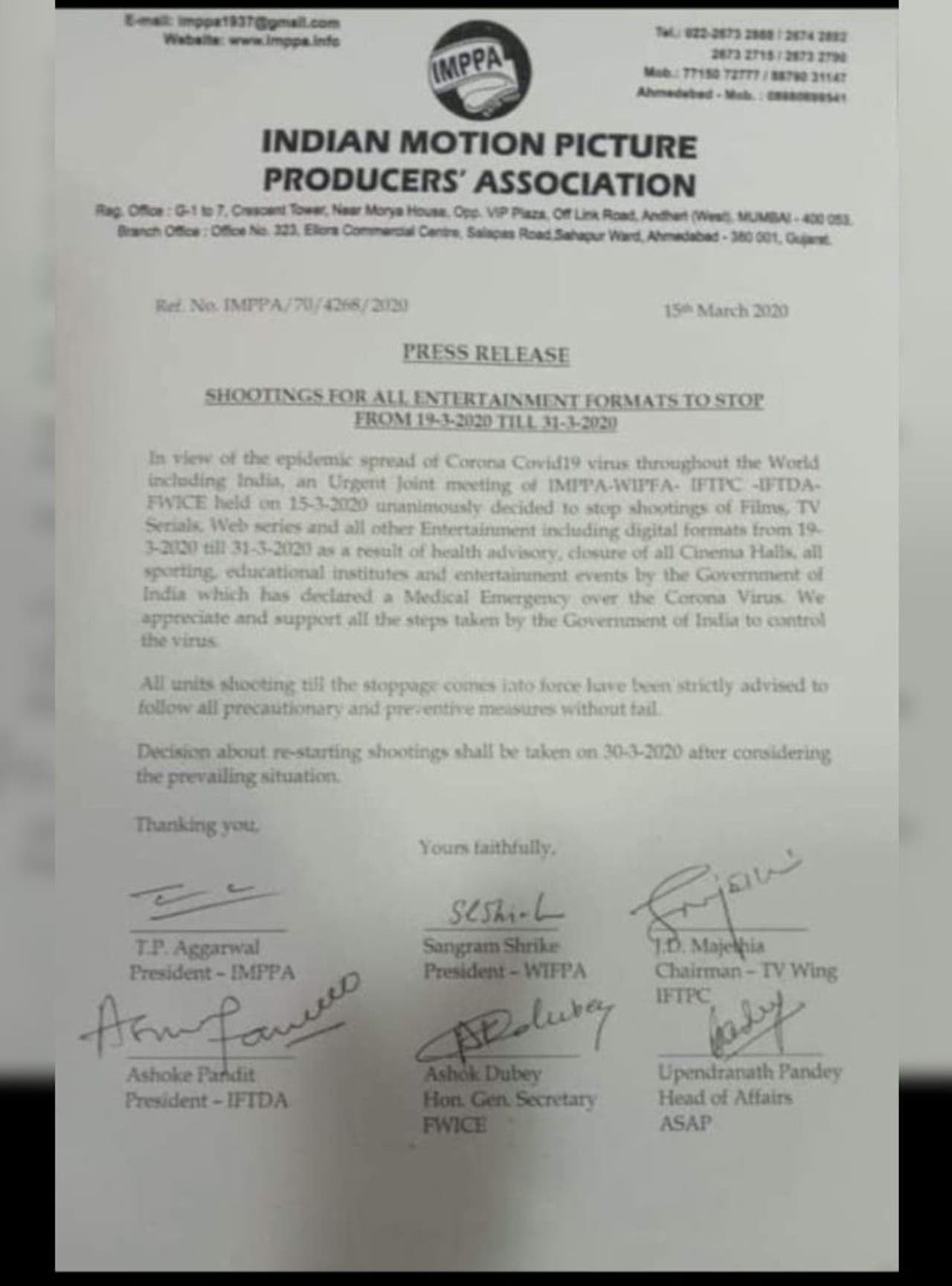 বন্ধ হল টলিউড এবং ছোটপর্দার সমস্ত শ্যুটিং। আগামী ৩১ মার্চ পর্যন্ত বন্ধ থাকবে শ্যুটিংয়ের যাবতীয় কাজ। ৩০ মার্চ ফের নয়া সিদ্ধান্তে আসবে ইণ্ডিয়ান মোশন পিকচার্স প্রডিসার্স অ্যাসোসিয়েশন।