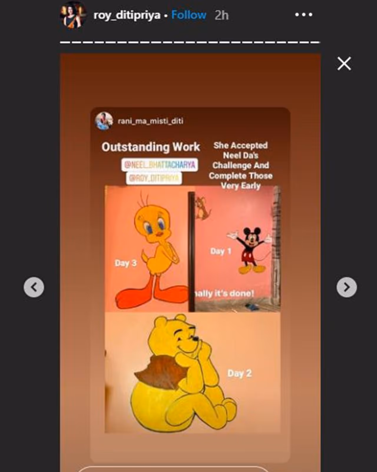 সম্প্রতি নিজের ইনস্টাগ্রাম প্রোফাইলে নিজের ঘরের দেওয়ালে আঁকা ছবি পোস্ট করলেন। দিন চারেক ধরে দেওয়ালে এঁকেছেন নিজের পছন্দের কার্টুন চরিত্রগুলি। যার মধ্যে রয়েছে পুহ, মিকি মাউজ এবং ট্যুইটি। ট্যুইটি সম্ভবত দিতিপ্রিয়ার সবচেয়ে পছন্দের। প্রতিটি কার্টুন চরিত্রের বড়ো পেন্টিং করে পোস্ট করেছেন সোশ্যাল মিডিয়ায়।