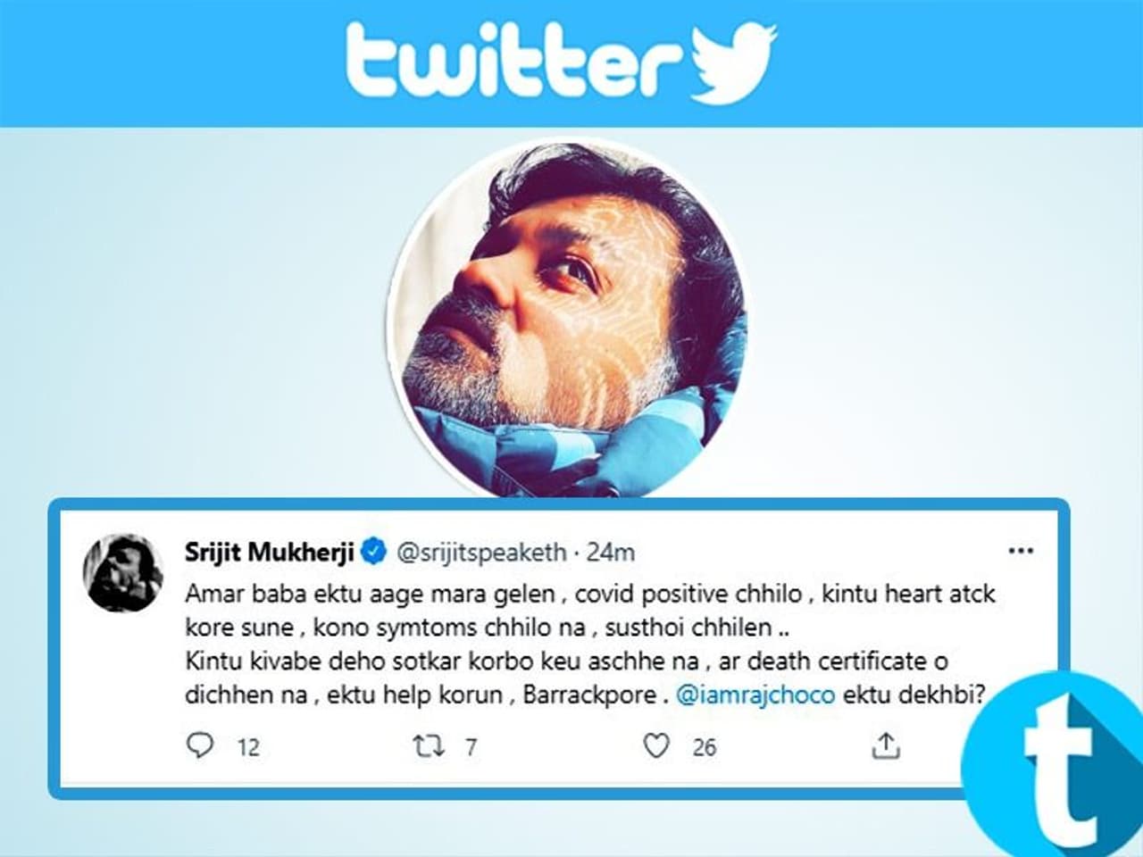 বিখ্যাত চলচ্চিত্র পরিচালক সৃজিত মুখোপাধ্যায়ের এক টুইটকে ঘিরে মঙ্গলবার সকালে চাঞ্চল্য ছড়ায় নেটদুনিয়ায়। কারণ পরিচালক তার করা টুইটে লিখেছিলেন, 'আমার বাবা মারা গেলেন, কোভিড পজিটিভ ছিল, কিন্তু হার্ট অ্যাটাক করে, কোন লক্ষণ ছিল না। সুস্থই ছিলেন... কিন্তু কীভাবে দেহ সৎকার করব কেউ আসছে না, ডেথ সার্টিফিকেটও দিচ্ছেন না, একটু হেল্প করুন, ব্যারাকপুর,রাজ চক্রবর্তী একটু দেখবি?'- পরিচালক সৃজিতের এই টুইট রীতিমতো বিভ্রান্তি ফেলে দেয় নেটদুনিয়ায়। অনেকেই এই টুইটে সৃজিতকে সমাবেদনা জানিয়েছেন। দাবানলের মতো খবর ছড়িয়ে পড়ে নেটদুনিয়ায়। পরিচালক সৃজিতের বাবা আর নেই।
