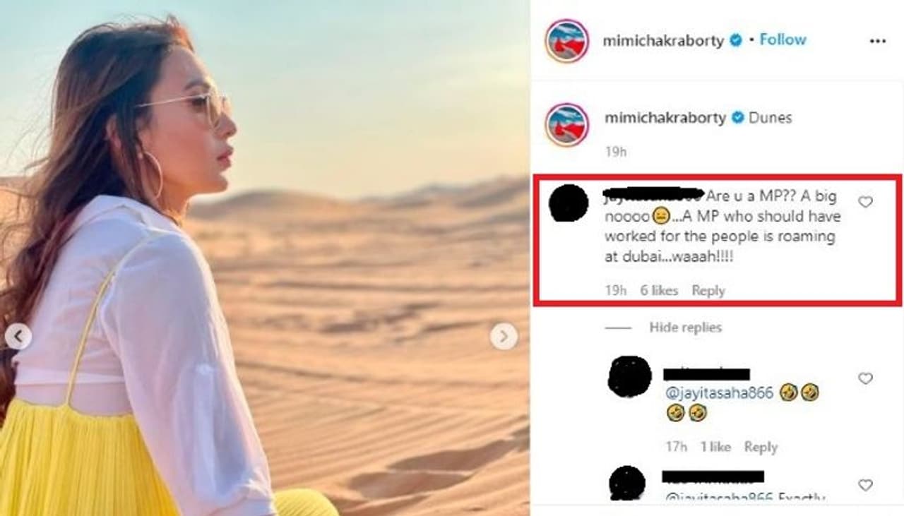 মিমির নানা পোস্টেই মাঝে মধ্যে ধেয়ে আসে নিন্দুকেরা। সেই নেটবাসী লিখেছে, "আপনি কি সাংসদ। একেবারেই না। একজন সাংসদের নিজের দায়িত্ব পালন করা উচিত। সেখানে আপনি দুবাইয়ে ঘুরে বেড়াচ্ছেন।" সাংসদ বলে কি বিদেশভ্রমণেও বাধা। নিন্দুকের মন্তব্যের বিরুদ্ধে প্রশ্ন তুলছে ভক্তরা। এই প্রথমবার অবশ্য নয়। মিমি এবং নুসরতের যেকোনও পোস্টেই হঠাৎই এই অভিযোগের বৃষ্টি শুরু হয়। যদিও এই মন্তব্যের কোনও জবাব দেন না তাঁরা। এই ধরণের অভিযোগ এড়িয়ে যাওয়াই শ্রেয় মনে করেন তাঁরা।