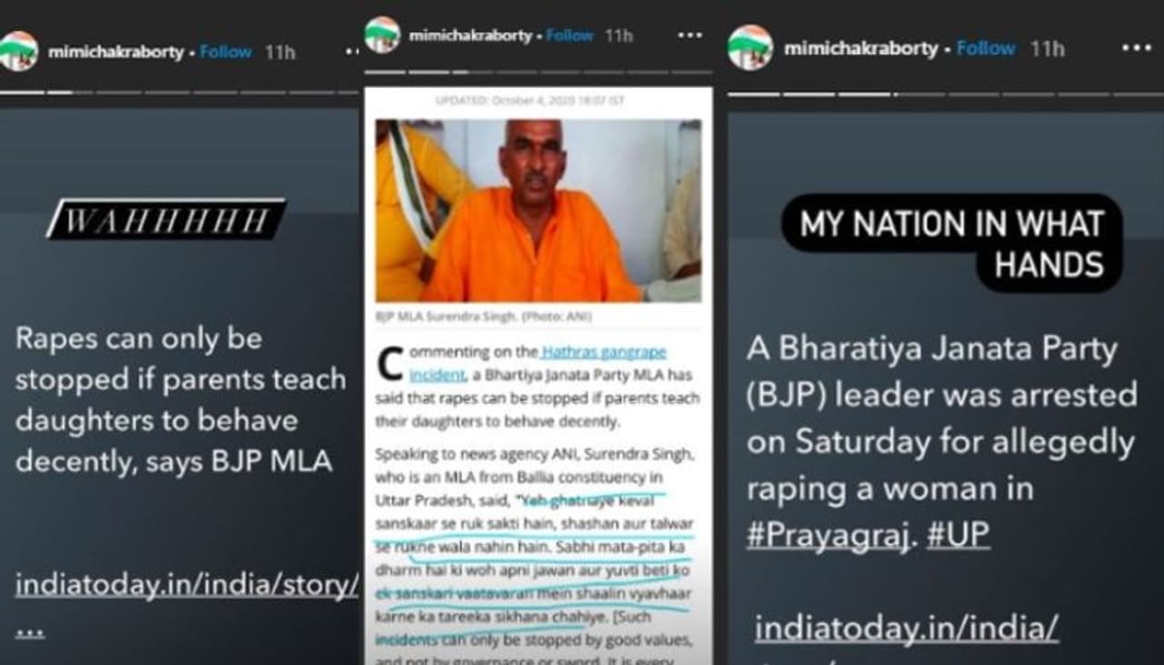 মিমি এই মন্তব্যে বেজায় চটে লিখেছেন, "কাদের হাতে রয়েছে আমার দেশ।" অবাক হয়ে ধীক্কার জানানো ছাড়া তাঁর কাছে আর কোনও উপায় নেই। ২০২০ সালে দাঁড়িয়ে ধর্ষণকাণ্ড নিয়ে মহিলাদের সমর্থনে কথা না বলে তাদের ভদ্রতা এবং শিক্ষানীতি দেওয়ার কথা বলায় স্বাভাবিকভাবেই ক্ষুব্ধ হয়েছে গোটা দেশ। পাশাপাশি ক্ষোভ উগরে দিয়েছেন মিমিও।