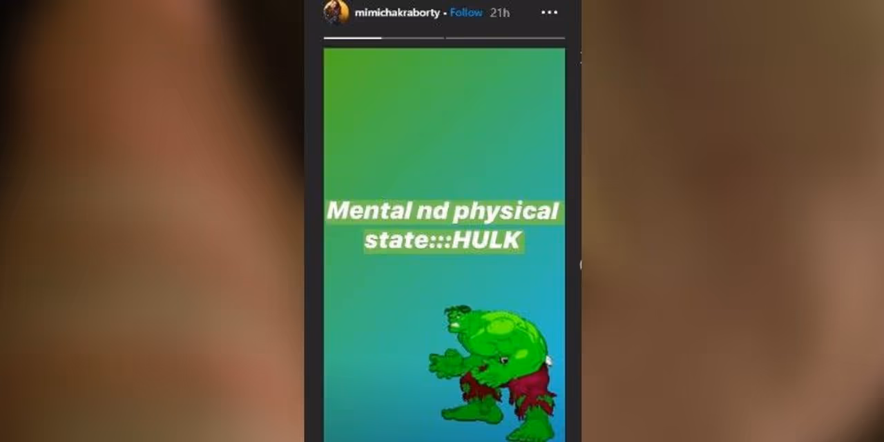 মিমির হাল দিনের পর দিন খারাপ হয়েই চলেছে। ইনস্টা স্টোরিতে সুপারহিরো হাল্কের ভিডিও শেয়ার করেন তিনি। সেই অবস্থার সঙ্গে নিজের অবস্থার কথা বোঝানোর চেষ্টা করলেন অভিনেত্রী।