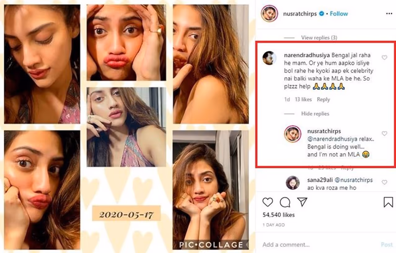 সারক্যাজমের টাচ রেখেই উচিত শিক্ষা দিয়েছেন সেই নেটিজেনকে। কমেন্ট সেকশনে ভক্তরা সেই ব্যক্তিকে যথেষ্ট ভালমন্দ শুনিয়ে ফেলেছে এরই মধ্যে। নুসরত নিজের বেশ কয়েকটি সেলফির কোলাজ বানিয়ে পোস্ট করেছিলেন ইনস্টাগ্রামে। সেখানেই এমন কেমন্ট করে বসে সেই ব্যক্তি। এর আগেও নুসরতের পোস্টে এমন রাজনৈতিক মন্তব্য করেছে বহু সাইবারবাসী। এভআবে সোশ্যাল মিডিয়ায় মন্তব্য করা থেকে নিজেকে বিরত রাখেন নুসরত। তবে কিছু ক্ষেত্রে উত্তর না দিয়ে থাকা যায় না বলেই এই পদক্ষেপ অভিনেত্রী।