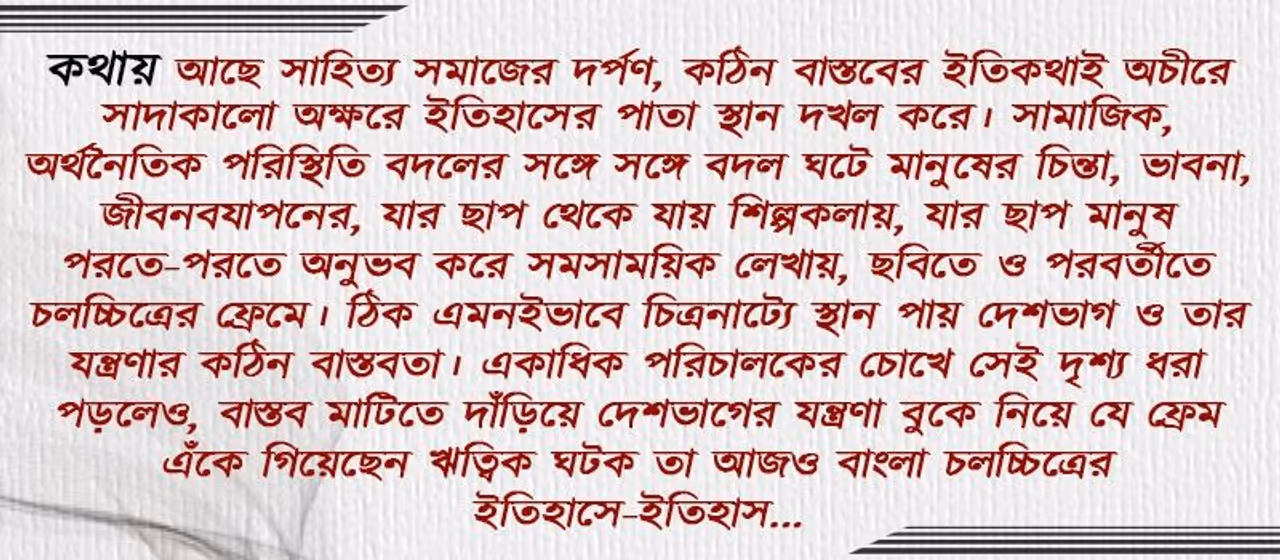 বাংলা চলচ্চিত্রের ইতিহাসে দেশভাগের যন্ত্রণা ঘটকের হাত ধরেই ফিরে পাওয়া ভিন্ন ঘরানার স্বাদ না পাওয়ার যন্ত্রণা দিয়ে বুঁনেছিলেন তিন ছবি যা আজও চলচ্চিত্র জগতের ইতিহাস চলচ্চিত্রের