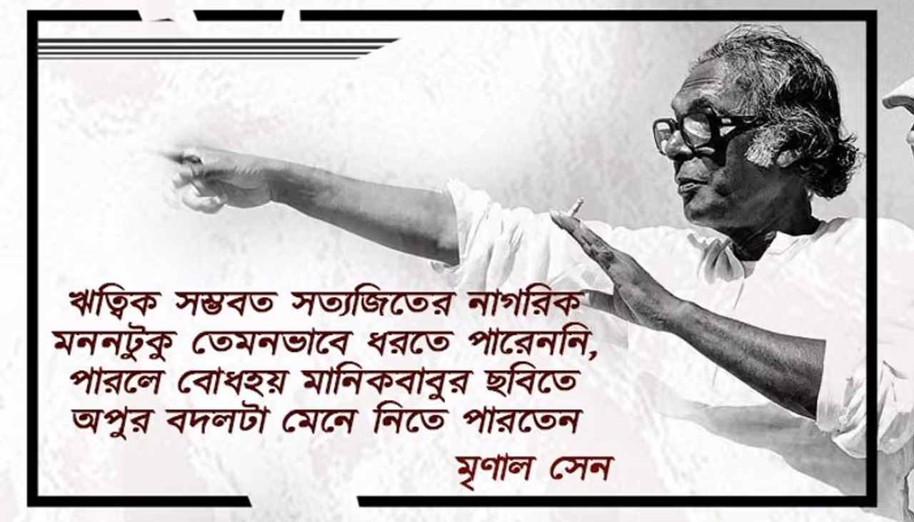 ঋত্বিক ঘটক সত্যজিৎ-এর হাতে অপুর কলকাতা মুখী হেয় ওঠাটা মেনে নিতে পারেননি। আর তার সূত্র ধরেই মৃণাল সেন বলেছিলেন- 'ঋত্বিক সম্ভবত সত্যজিতের নাগরিক মননটুকু তেমনভাবে ধরতে পারেননি, পারলে বোধহয় মানিকবাবুর ছবিতে অপুর বদলটা মেনে নিতে পারতেন।' আর এখান থেকেই স্পষ্ট হয়ে উঠেছিল তাঁরও শেকড় ছেঁড়ার যন্ত্রণাটা অনেকেই হয়তো দেখে উঠতে পারেননি। এই আক্ষেপই বুকে নিয়ে সারা জীবন সমাজের মানসিকতার সঙ্গে লড়াই চালিয়ে গিয়েছেন ঘটকবাবু।