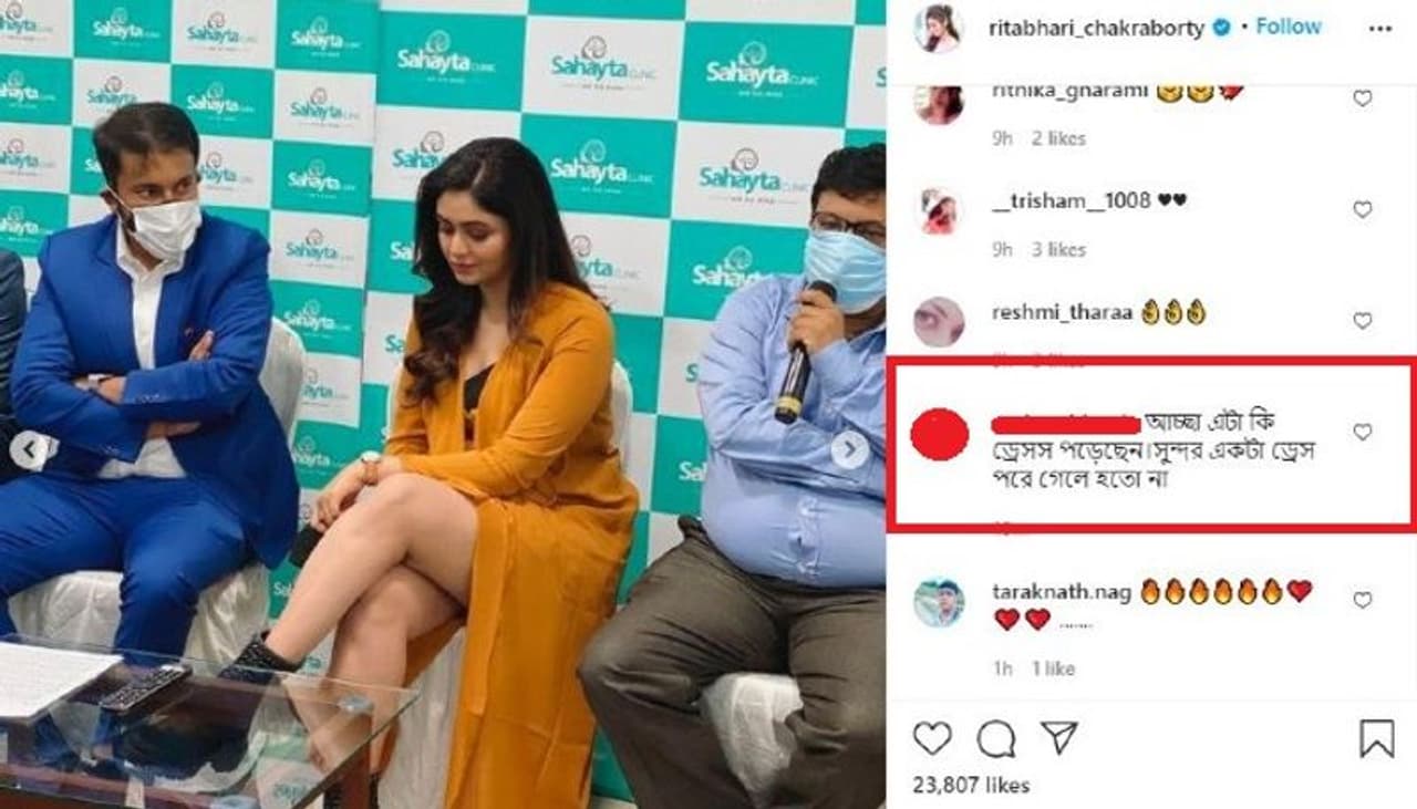 একজন স্পেশ্যাল চাইল্ডের সঙ্গে চিকিৎসালয়ের উদ্বোধন করেন তিনি। গোটা বিষয়টি নেটিজেন এবং ভক্তদের মুগ্ধ করেছে। তবে এরই মাঝে নিন্দুক তো থাকবেই। তাঁর পোশাক নিয়ে ঋতাভরীকে তপ দেগেছে এক নেটিজেন। তাঁর কথায়, ঋতাভরীর এমন ছোট পোশাক পরা উচিত হয়নি। হাঁটুর বেশ খানিকটা উপরে প্রায় অনাবৃত উরু বলা যেতে পারে। এমনই এক পোশাক পরে এসেছিলেন অনুষ্ঠানে। সকলের সামনেই পায়ের উপর পা তুলে বসে তিনি। সেই ছবি দেখেই এক নেটিজেন তাঁকে তথাকথিত 'সভ্যতা'র পাঠ পড়ায়। বলে, "আচ্ছা এটা কি ড্রেসস পড়েছেন।সুন্দর একটা ড্রেস পরে গেলে হতো না।" এর কোনও উত্তর ঋতাভরী দেননি।