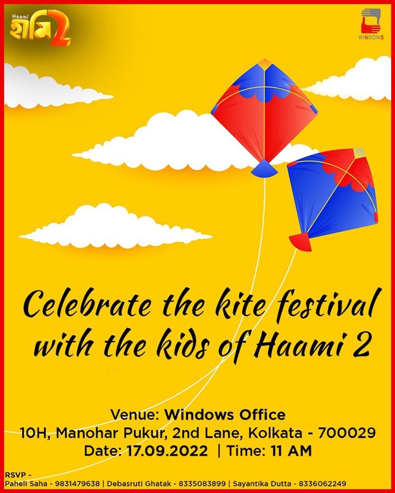 বিশ্বকর্মা পুজোর দিন এবার কচিকাঁচাদের নিয়ে ঘুড়ি উৎসবের আয়োজন করেছে শিবপ্রসাদ ও নন্দিতার উইন্ডোজ প্রোডাকশন। টিম উইন্ডোজের পক্ষ থেকে, সকলকে আন্তরিকভাবে আমন্ত্রণ জানানো হয়েছে। আরও জানানো হয়েছে, আগামীকাল উইন্ডোজে হামি ২ -এর সকল বাচ্চাদের সঙ্গে ঘুড়ি উৎসব আয়োজন করা হয়েছে। সকাল ১১ টার সময় ঘুড়ি উৎসব শুরু হবে উইন্ডোজ-এর অফিসে। এর পাশাপাশি এও জানানো হয়েছ চলতি বছরের ক্রিসমাসে প্রেক্ষাগৃহে মুক্তি পেতে চলেছে হামি ২।
