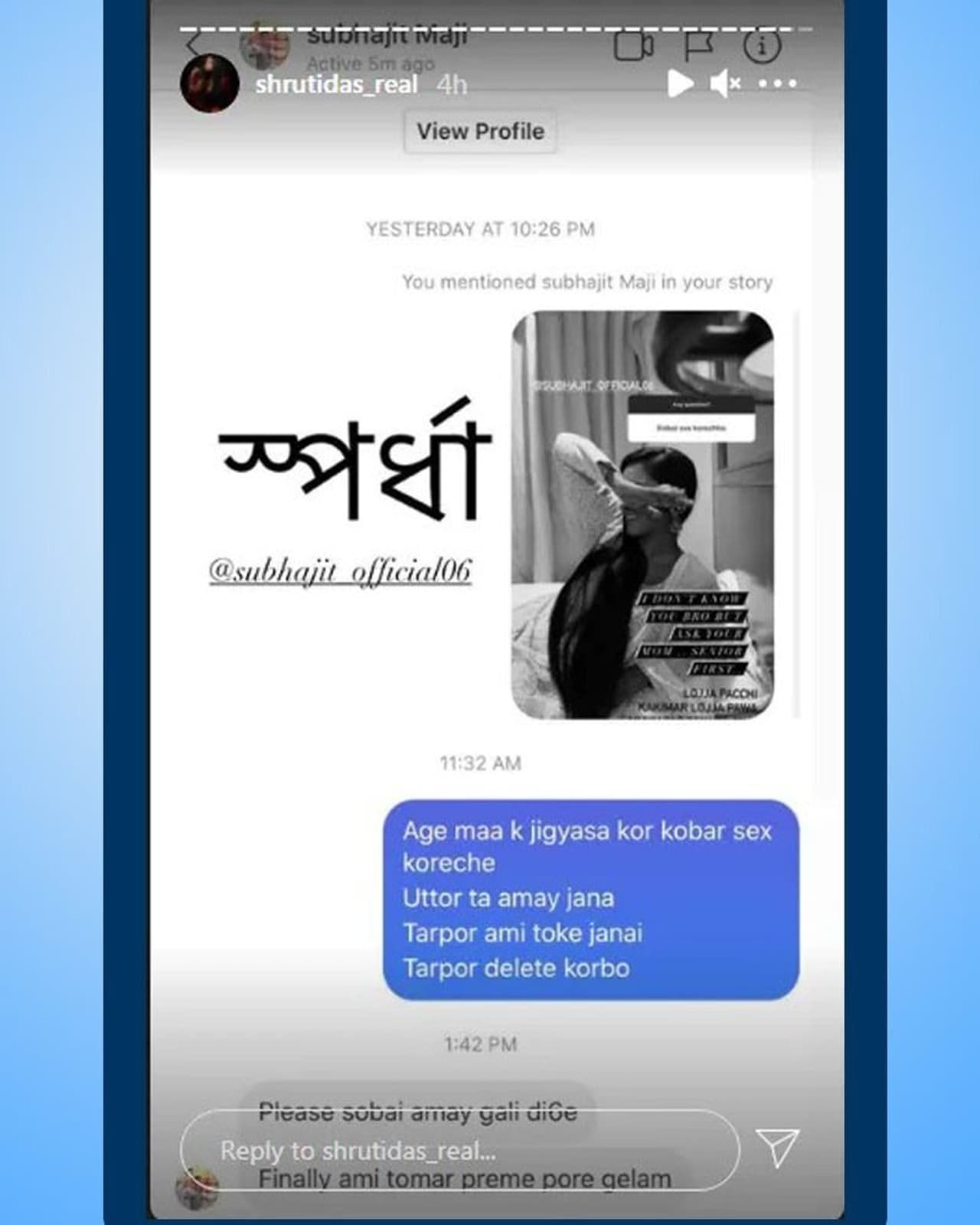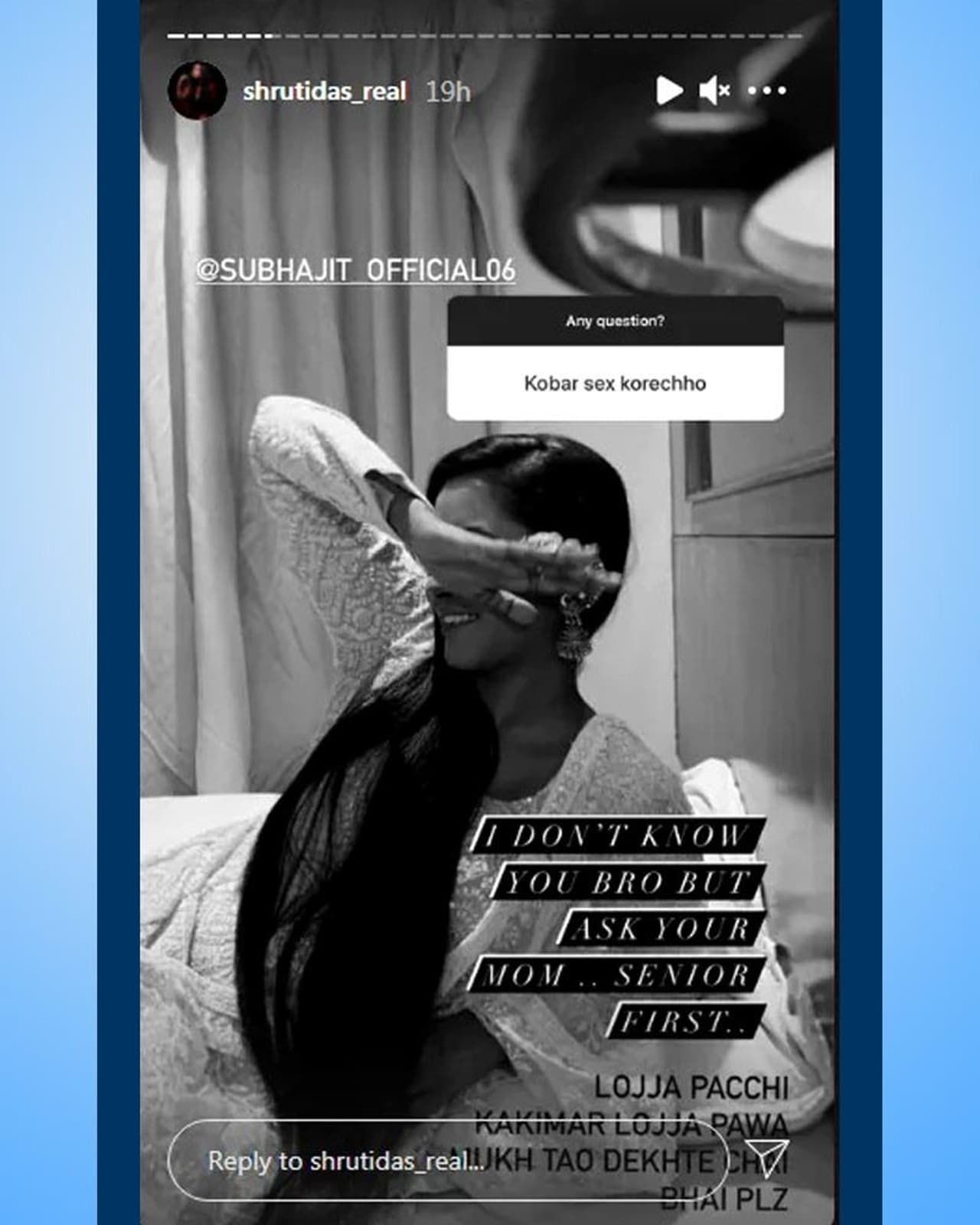 সম্প্রতি সোশ্যাল মিডিয়ায় ভক্তদের সঙ্গে জমিয়ে আড্ডা দিচ্ছিলেন শ্রুতি। সেখানেই এক অনুরাগী সকলের সামনেই নোংরা প্রশ্ন করে ওঠে। সোশ্যাল মিডিয়ায় প্রকাশ্যেই শ্রুতিকে জিজ্ঞাসা করে, কতবার সেক্স করেছো? শ্রুতিও ছাড়ার মেয়ে নন। এই নোংরা প্রশ্নের মোক্ষম জবাব দিয়েছেন নায়িকা।