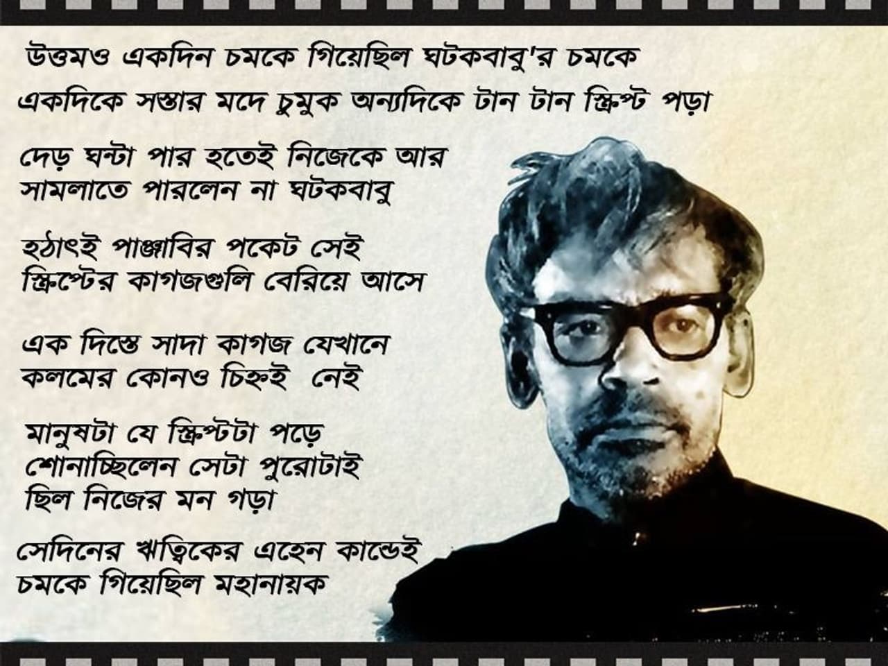 উত্তমও একদিন চমকে গিয়েছিল ঘটকবাবু'র চমকে একদিকে সস্তার মদে চুমুক অন্যদিকে টান টান স্ক্রিপ্ট পড়া ঘটকবাবু পড়ছেন আর উত্তম মন্ত্রমুগ্ধের মতো শুনছেন মানুষটা যে স্ক্রিপ্ট পড়ে শোনাচ্ছিলেন সেটা পুরোটাই ছিল নিজের মন গড়া