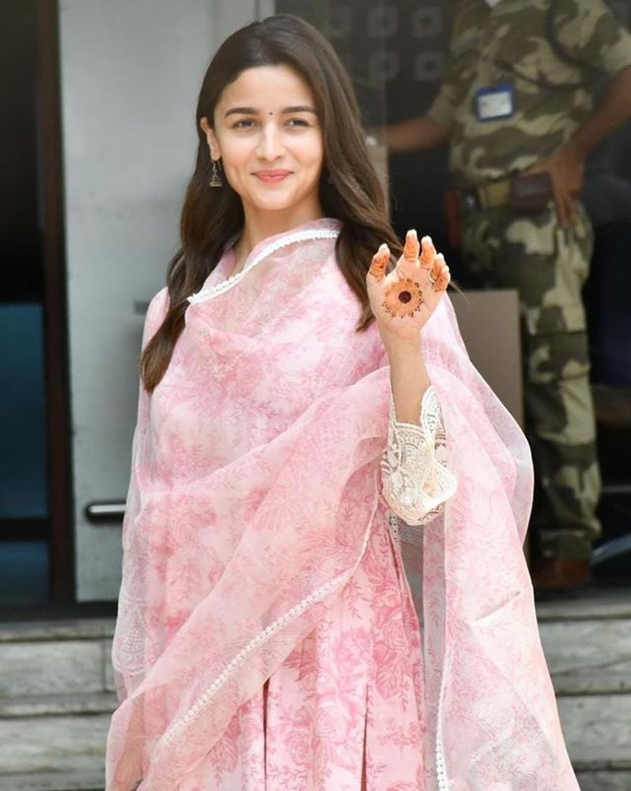 নিখুঁত হাতে গাঢ় মেহেন্দিটা তখনও জানান দিচ্ছে বিয়ের তারিখ খুব পিছনে নয়। ফর্সা গালে টোল ফেলে যখন ক্যামেরাবন্দি হলেন তিনি, ততক্ষণে ফ্যানেদের মনে ঝড়। বিয়ের পর প্রথমবার ক্যামেরার সামনে এলেন মিসেস আলিয়া ভাট কাপুর। পরনে হালকা গোলাপি চুড়িদার। মেকআপের বাহুল্য নেই, তবে রয়েছে একরাশ স্নিগ্ধতা, যা মুগ্ধতা ছড়িয়ে দিল ভক্তদের মনে।