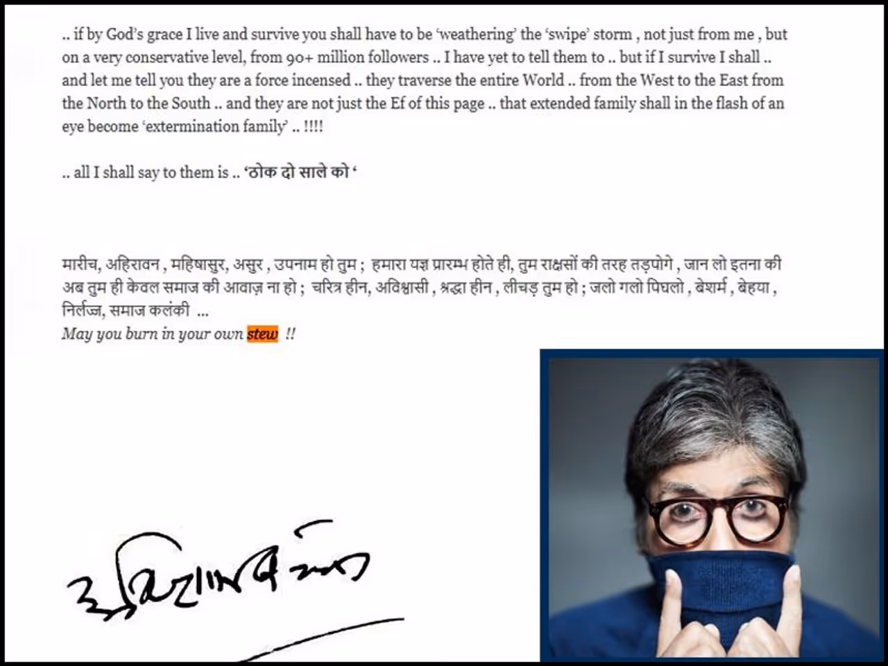 অমিতাভ অত্যন্ত ক্ষুব্ধ হয়ে চিঠিতে লিখেছেন, মিস্টার অজ্ঞাতনামা ব্যক্তি, আপনি নিজের বাবার নামও লেখেননি, কারণ আপনি নিজেও আপনার জন্মদাতার নাম জানেন না। আমি যদি মরে যাই তুমি আর কোন তারকার নাম নিয়ে তোমার ডায়েরিটা লিখতে পারবেন না। করুণা হচ্ছে খুব। আপনার লেখা সকলের নজরে আসার কারণ হল, আপনি অমিতাভকে উল্লেখ করে লিখেছেন, নাহলে এর কোনও অস্তিত্ব নেই। যদি ভগবানের দয়ায় আমি বেঁচে যাই, তাহলে আপনি দেখতে পারবেম এই সোয়াইপ ঝড় শুধু আমার জন্য নয়, ৯০ মিলিয়নের বেশি অনুসরণকারী খুব রক্ষণশীল স্তরে রয়েছে।