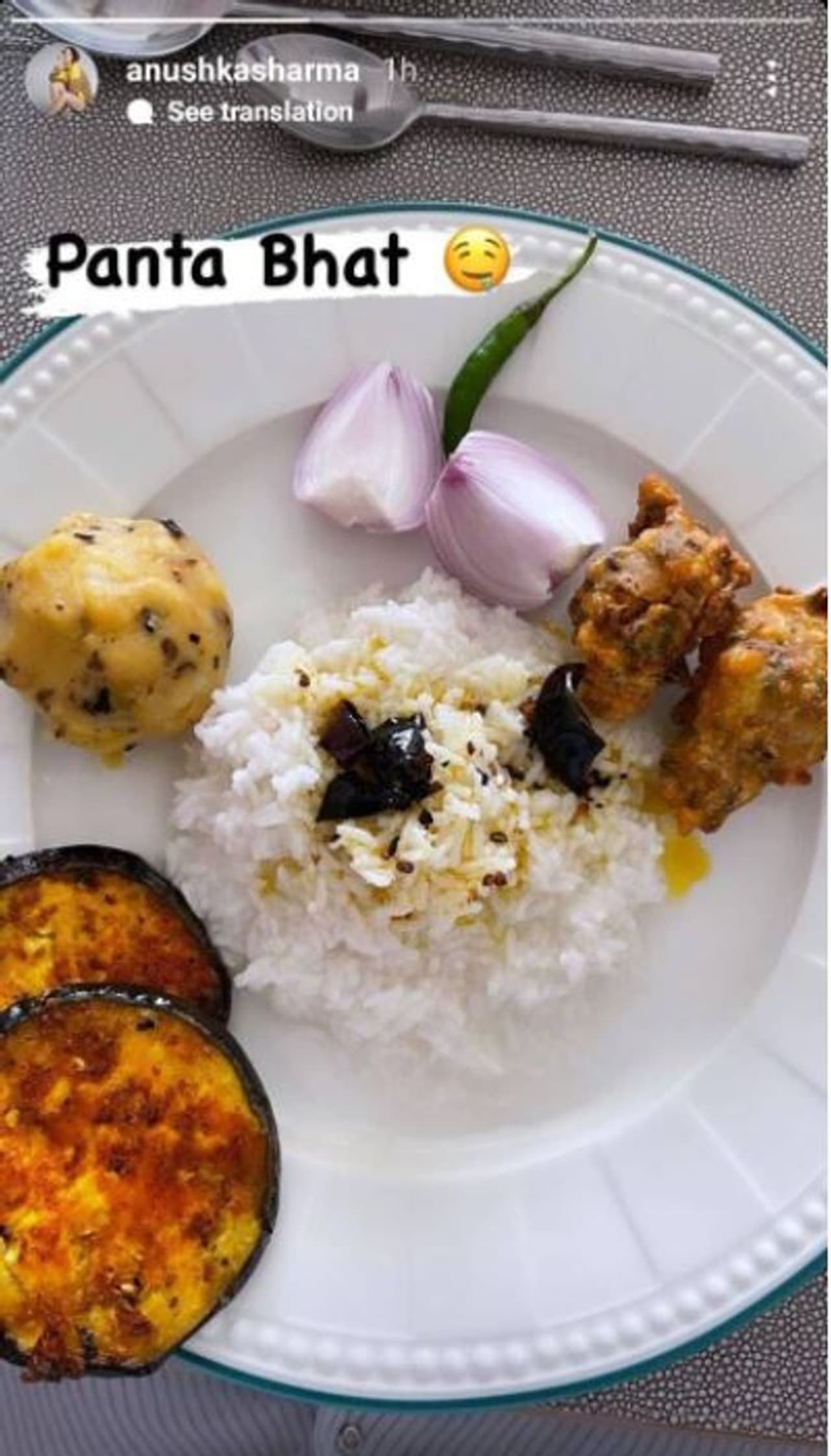 আসলে অনেকেই বলেন যে পান্তাভাত খেলে নাকি মোটা হয়ে যায়। শরীর ঠান্ডা হওয়ার পাশাপাশি এটি খেলে খুব ঘুমও পায়। তাই এই ভাতের সঙ্গে মোটা হওয়ার বিষয়টি যুক্ত রয়েছে। কিন্তু, হঠাৎ করে অনুষ্কা নিজের ডায়েট ভুলে এই পান্তাভাতে মজলেন কেন? সম্প্রতি ইনস্টাগ্রাম স্টোরিতে পান্তাভাতের ছবি পোস্ট করেছেন তিনি। সেখানে পান্তাভাতের সঙ্গে রয়েছে কাঁচা পেয়াজ, লঙ্কা, আলু ভর্তা, বড়া, বেগুন ভাজা। যা দেখে জিভে জল এসে যায়। আর এই ছবির ঠিক উপরের দিকে অনুষ্কা লিখেছেন 'পান্তাভাত'।