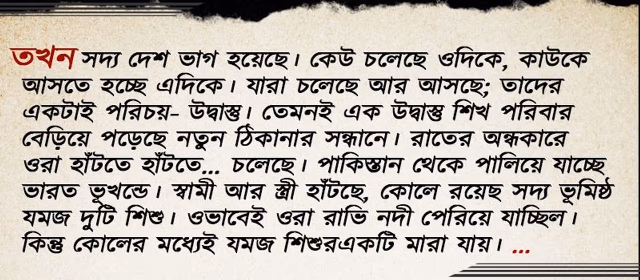 তখন সদ্য দেশ ভাগ হয়েছে। কেউ চলেছে ওদিকে, কাউকে আসতে হচ্ছে এদিকে। যারা চলেছে আর আসছে; তাদের একটাই পরিচয়- উদ্বাস্তু। তেমনই এক উদ্বাস্তু শিখ পরিবার বেড়িয়ে পড়েছে নতুন ঠিকানার সন্ধানে। রাতের অন্ধকারে ওরা হাঁটতে হাঁটতে... চলেছে। পাকিস্তান থেকে পালিয়ে যাচ্ছে ভারত ভূখন্ডে। স্বামী আর স্ত্রী হাঁটছে, কোলে রয়েছ সদ্য ভূমিষ্ঠ যমজ দুটি শিশু। ওভাবেই ওরা রাভি নদী পেরিয়ে যাচ্ছিল। কিন্তু কোলের মধ্যেই যমজ শিশুরএকটি মারা যায়।