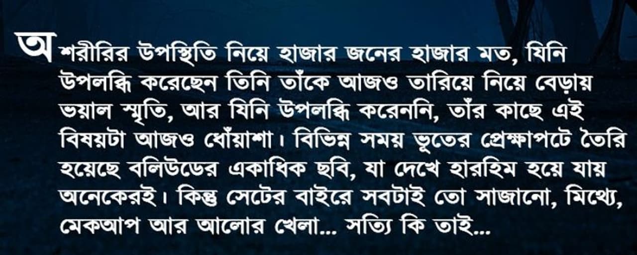 কখনও কখনও যা রটে তার কিছুটা ঘটে। কখনও আবার যা ঘটে, অনেক সময়ই সামনে আসে না। তারকাদের ক্ষেত্রেও এমনটাই হয়ে থাকে। একাধিক গুজব, কুসংস্কারের ভয়ে অনেক তারকাই হয়তো ছবির সেট, মনের ভয় নিয়ে প্রকাশ্যে মুখ খুলতে পছন্দ করেন না, কিন্তু অনেক তারকা আবার তা শেয়ার করে থাকেন ভক্তদের সঙ্গে। ভূতের ছবির শ্যুটিং সেটের কথা তো অনেকেই শুনেছেন, কিন্তু শ্যুটিং সেটে ভুত, তা হয়তো অনেকেরই শোনা হয়ে ওঠেনি। বলিউড তারকাদের জীবনের এমনই কিছু কাহিনি আজকের স্পেশ্যাল স্টোরির পাতায়।