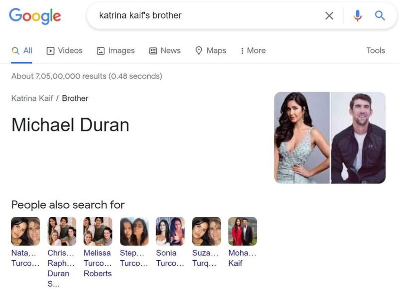 ক্যাটরিনার ভাইকে খুঁজতে গেলে মাইকেল ফেলপস-এর সঙ্গে বলি অভিনেত্রীর যে কোলাজ ছবিটি দেখাচ্ছে, তা গুগলে রিভার্স সার্চ করলে দেখা যাচ্ছে, ছবিটি ক্যাটরিনা এবং মাইকেল ফেলপস-এর একসঙ্গে একটি বিজ্ঞাপনে কাজ করার সঙ্গে সম্পর্কিত। ২০১৯ সালের মার্চ মাসে মুম্বই এসেছিলেন মার্কিন সাঁতারু। একটি স্পোর্টস ব্র্য়ান্ডের বিজ্ঞাপনি শুটিং-এ ক্যাটরিনার সঙ্গে কাজ করেছিলেন তিনি। একটি জিমে ফেলপস-এর সঙ্গে তাঁর বাদানুবাদের একটি ছবিও সোশ্যাল মিডিয়ায় দিয়েছিলেন ক্যাটরিনা। গুগলের ভুলে ফেলপস-এর ছবি কীকরে ক্যাটরিনা কাইফের দাদার ছবি বলে পরিচিত হল, তা সত্যিই বিস্ময়কর।