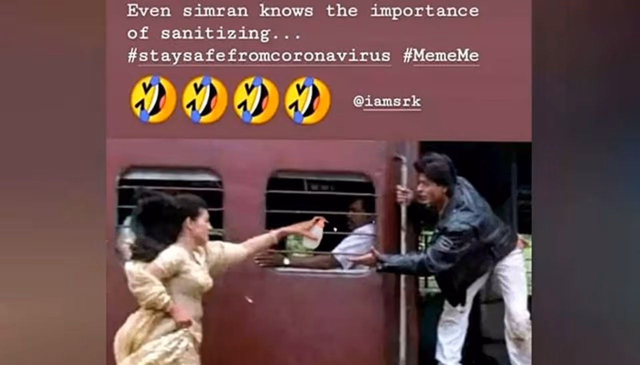 করোনা আতঙ্কে সচেতনতা বাড়াতে সোশ্যাল মিডিয়ার দৌলতে প্রকাশ্যে এসেছে একটি মিম শাহরুখ-কাজলের বিখ্যাত ছবির ট্রেনের দৃশ্যই মিমে দেখানো হয়েছে কাজলের হাতে স্যানিটাইজার যা তিনি শাহরুখের হাতে তুলে দিচ্ছেন সোশ্যাল মিডিয়ায় মুহূর্তে ভাইরাল হয়েছে এই মিম