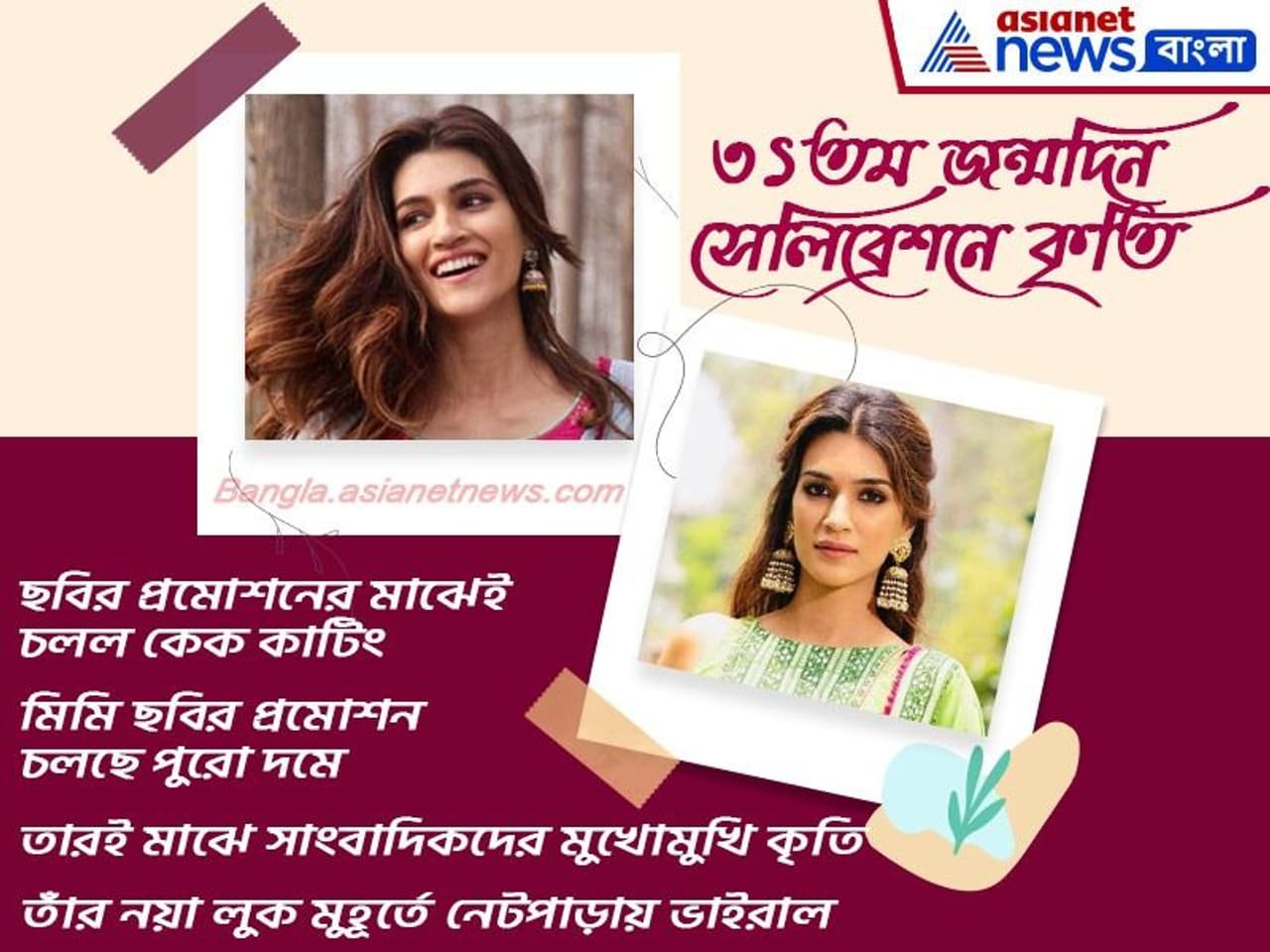 এদিন তিনি উপস্থিত ছিলেন গোরেগাঁও এর ফিলমিস্তান স্টুডিওয়। আর সেই ফিল্মিস্তান স্টুডিওর ফ্লোরেই এবার কাটল তাঁর স্পেশ্যাল দিন। সেখান থেকে বেরিয়ে এসে কৃতি এদিন সাংবাদিকদের সামনে বার্থডে কেকও কাটেন। শর্ট নিয়ন গ্রিন ড্রেসের সঙ্গে ম্যাচিং করা ছিল কৃতির হিলস আর ঢেউ খেলানো বাদামি রঙের লুজ স্টাইলড হেয়ার। 'মিমি' ছবির নায়িকাকে পরমা সুন্দরী-র মতই লাগছিল এদিন।