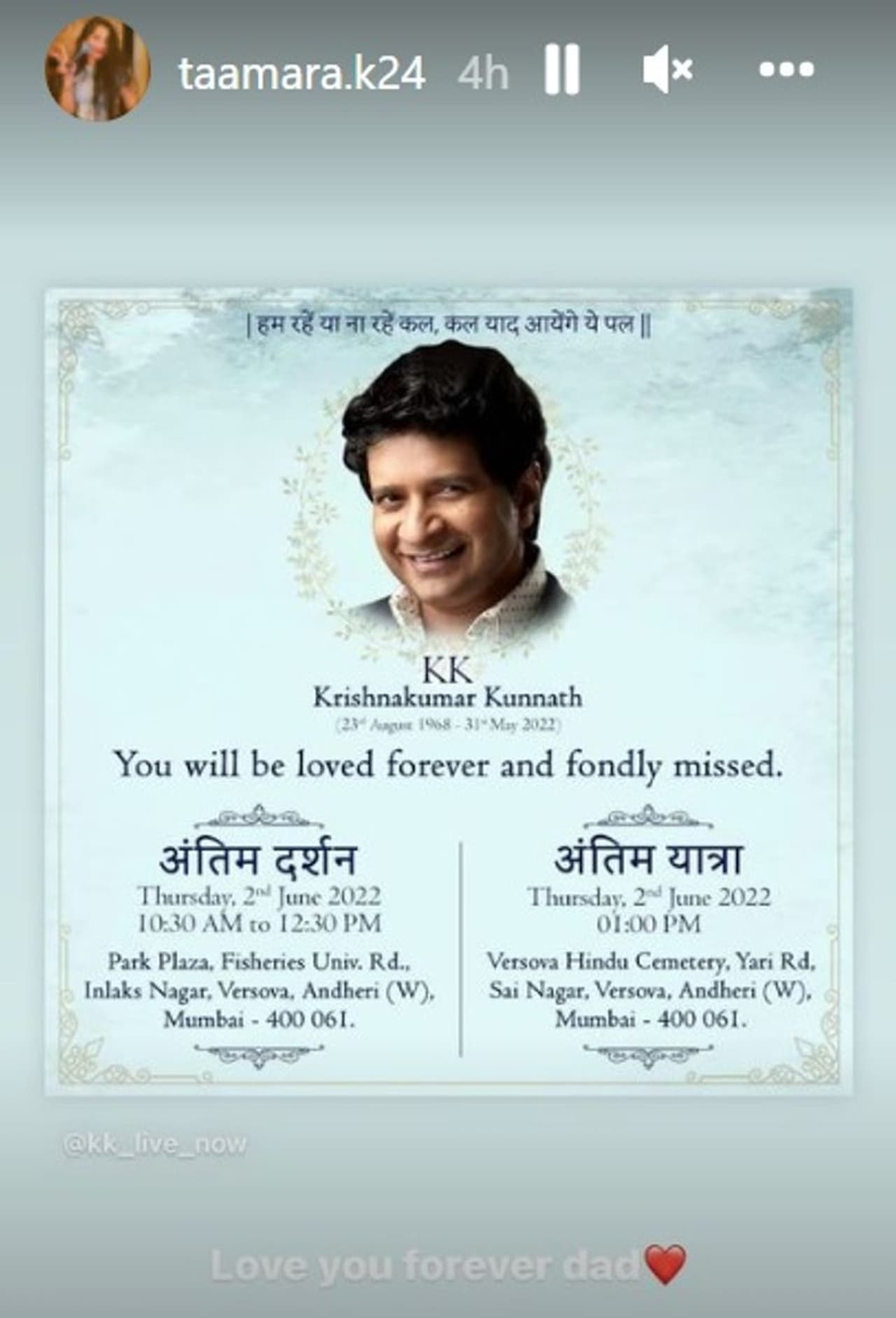 মুম্বইয়ের পার্ক প্লাজা কমপ্লেক্সে পরিবারের সঙ্গে থাকতেন কেকে। এখন সেখানেই শায়িত রয়েছে তার মরদেহ। ইতিমধ্যেই পার্ক প্লাজার সামনে উপচে পড়ছে ভিড়। আজ সকাল ১০ টা থেকে বেলা ১২ টা পর্যন্ত প্রিয় শিল্পীকে শ্রদ্ধা জানাতে পারবেন সাধারণ মানুষ। শেষবারের মতো প্রিয় শিল্পীকে কাছ থেকে দেখতেই জড়ো হয়েছেন মুম্বইয়ের মানুষ। বৃহস্পতিবার বেলা ১২ টার সময়েই মুম্বইয়ের ভারসোভার মুক্তিধাম শশ্মানে তার শেষকৃত্য হবে কেকে-র। এই শশ্মানেই তার মায়েরও শেষকৃত্য হয়েছিল। আর কিছুক্ষণের মধ্যেই সবটা শেষ। এক মুহূর্তের মধ্যে যেন সবটা ওলটপালট করে চিরঘুমের দেশে চলে গেলেন কেকে। বাবার মৃত্যুতে কান্নায় ভেঙে পড়েছে মেয়ে তামারা। সম্প্রতি একটি আবেগঘন পোস্ট করে বাবাকে স্মরণ করেছে মেয়ে। তামারার পোস্টে আবেগাপ্লুত হয়ে পড়েছেন ভক্তরা। বাবার শেষকৃত্যের কথা জানিয়ে তামারা লিখেছেন, তোমাকে সবসময় ভালবাসব বাবা।
