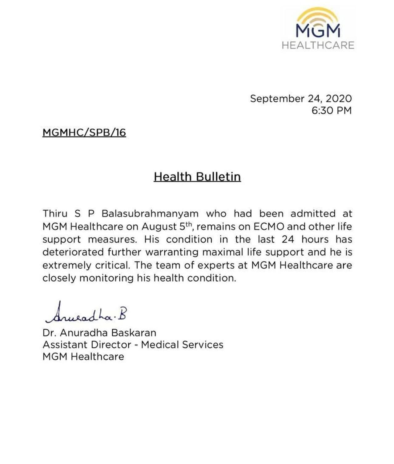 গত ২৪ ঘন্টায় প্রখ্যাত গায়ক এসপি বালাসুব্রমণিয়মের স্বাস্থ্যের উল্লেখযোগ্য অবনতি হয়েছে। তাঁর অবস্থা এই মুহূর্তে অত্যন্ত গুরুতর তাঁকে এখন সর্বাধিক লাইফ সাপোর্ট দিতে হয়েছে বলে বৃহস্পতিবার রাতের বুলেটিনে জানিয়েছেন তাঁর চিকিত্সকরা। গায়ককে নিবিড় পর্যবেক্ষণে রাখা হয়েছেন।