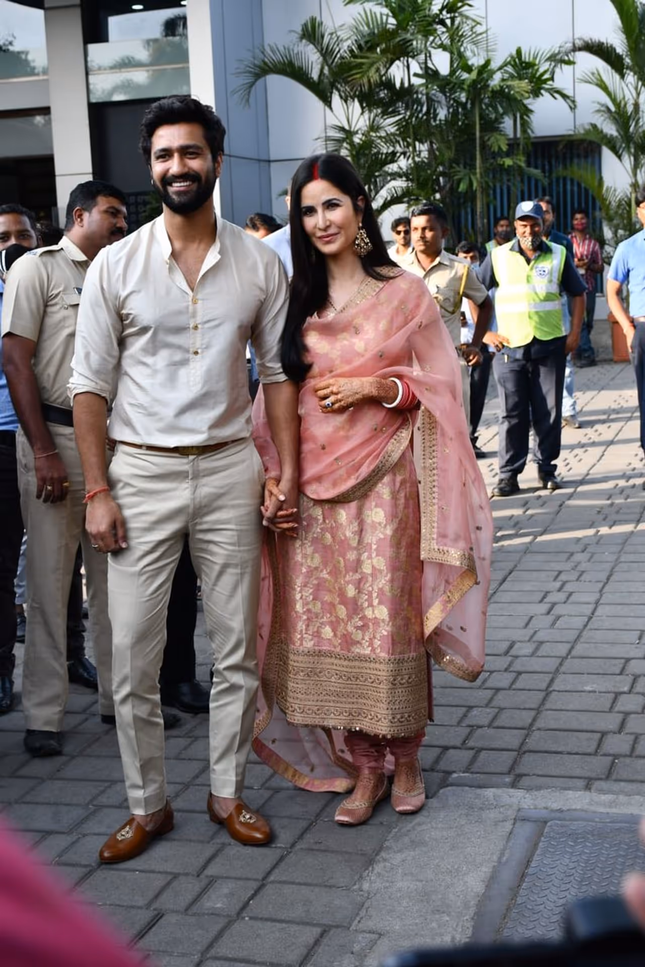 বিয়ে নিয়ে একাধিক লুকোছাপা ছিল তাঁদের মধ্যে। এমনকী, সম্পর্কে থাকার কথাও শেয়ার করেননি তাঁরা। পাশাপাশি বিয়ের কথাও তাঁদের খোলসা করতে দেখা যায়নি। তবে মধুচন্দ্রিমা থেকে ফিরে পাপারাৎজিদের ক্যামেরার সামনে দাঁড়িয়ে দীর্ঘক্ষণ হাসি মুখে পোজ দিলেন এই তারকা দম্পতি। সারাক্ষণ ভিকির হাত শক্ত করে ধরে থাকলেন তিনি।