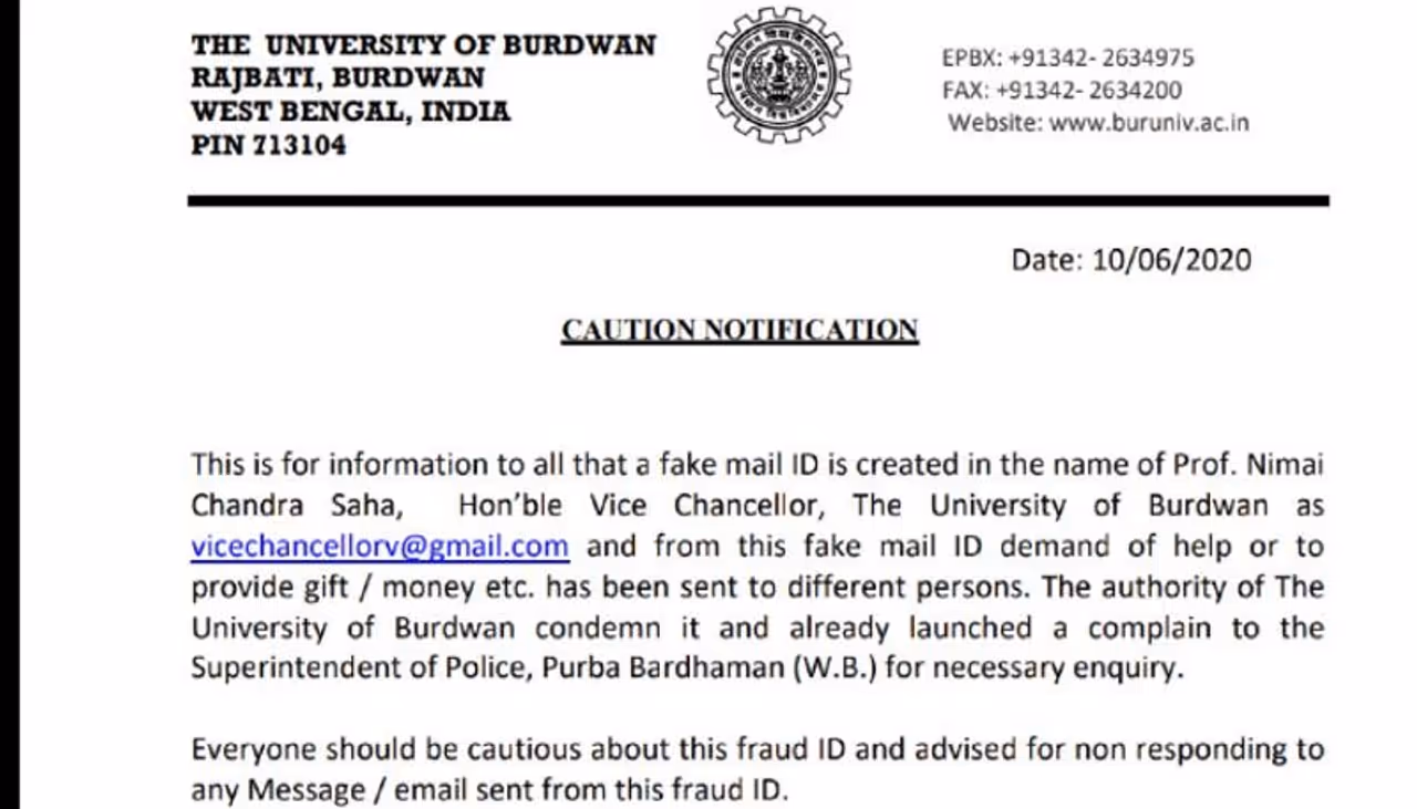 অর্থের দাবি তো ছিলই, গত কয়েক দিন ধরে আকর্ষণী উপহার প্রলোভন-সহ ই-মেল পাচ্ছিলেন বর্ধমান শহরে বাসিন্দারা। মেল আসছিল পাঠানো হচ্ছিল খোদ বর্ধমান বিশ্ববিদ্যালয়ের উপাচার্য নিমাইচন্দ্র সাহার তরফে। কী ব্য়াপার? যাঁরা এই ই-মেল পেয়েছেন, তাঁরা রীতিমতো চিন্তায় পড়ে গিয়েছিলেন। ১০ জুন ঘটনাটি নজরে আসে বর্ধমান বিশ্ববিদ্য়ালয় কর্তৃপক্ষের। খতিয়ে দেখে বোঝা যায়, বিশ্ববিদ্যালয়ের উপাচার্যের নামে তৈরি করা হয়েছে একটি ভুয়ো মেল আইডি। সেই আইডি ব্যবহার করেই চলছে দুষ্কর্ম। আর দেরি করেননি, বিশ্ববিদ্যালয়ের ওয়েবসাইটে সকলে সতর্ক করে একটি বিজ্ঞপ্তি দেন রেজিস্ট্রার অভিজিৎ মজুমদার। বিজ্ঞপ্তি স্পষ্ট ভাষায় জানিয়ে দেওয়া হয়, ভুয়ো অ্যাকাউন্ট তৈরি করে কেউ বা কারা এসব কাজ করছে। এর সঙ্গে বিশ্ববিদ্যালয় অথবা উপাচার্যের কোনও সম্পর্কই নেই। এখানেই শেষ নয়, বিশ্ববিদ্য়ালয়ের তরফে লিখিত অভিযোগ দায়ের করা হয় পূর্ব বর্ধমানের পুলিশ সুপারের দপ্তরে।