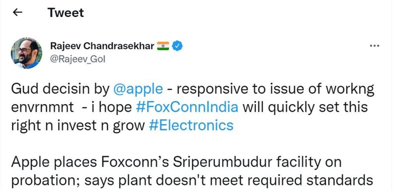 কেন্দ্রীয় তথ্যপ্রযুক্তি মন্ত্রী এদিন টুইট করে বলেন, কাজের পরিবেশের বিষয়ে অভিযোগের প্রতিক্রিয়ায় আপেল সংস্থা ভাল সিদ্ধান্ত নিয়েছে। একই সঙ্গে তিনি আশা প্রকাশ করেছেন, ফক্সকনইন্ডিয়া দ্রুত এই ত্রুটি সংশোধন করবে এবং ইলেক্ট্রনিক ক্ষেত্রে আরও বিনিয়োগ করবে এবং তাদের ব্যবসা বৃদ্ধি পাবে।
