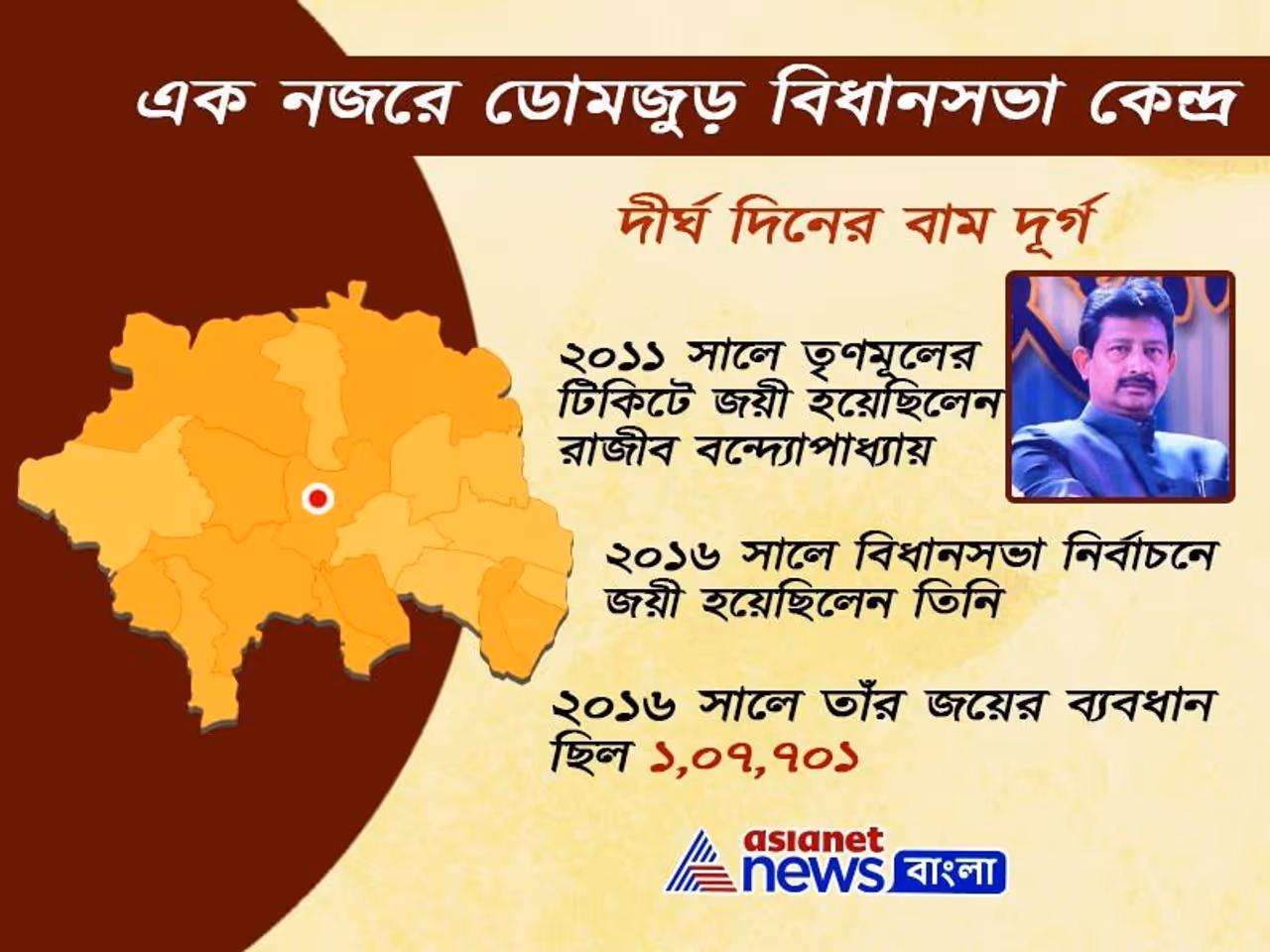 ২০১১ সালে বাম দুর্গে ফাটল ধরিয়ে ঘাসফুল ফুটিয়েছিলে তৎকালীন তৃণমূল কংগ্রেস প্রার্থী রাজীব বন্দ্যোপাধ্যায়। বাংলার বিধানসভা ভোটের এটাই এখন লক্ষ টাকার প্রশ্ন এবার কী ডোমজুড়ে পদ্ম ফোটাতে পারবেন রাজীব? সদ্যোই দল বদল করে তৃণমূল কংগ্রেস ছেড়ে তিনি এখন বিজেপির সদস্য। তবে এখনও রাজীব বন্দ্যোপাধ্যায়ের ওপর বাজি রাখতে রাজি বিজেপি। কারণ ডোমজুড়ের ভূমিপুত্র তিনি। ২০০৬ সালে তৃণমলের টিকিটে দাঁড়িয়েছিলেন তিনি। কিন্তু সেই সময় বাম প্রার্থীর কাছে হেরে যান রাজীব। তবে লড়াই থেকে সরে আসেননি।