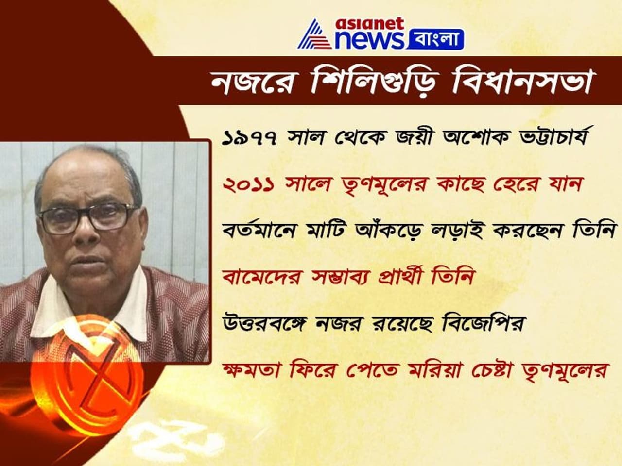 দীর্ঘ দিন ধরেই শিলিগুড়ি বিধানসভা কেন্দ্রের জনপ্রতিনিধিত্ব করছেন অশোক ভট্টাচার্য। ২০১১ সালে পালাবদলের বছর ঘাসফুল ঝড়ে পরাজিত হয়েছিলেন তিনি। তবে তার পরের নির্বাচনে আরও ম্যাজিক দেখিয়েছিলেন অশোক ভট্টাচার্য। তৃণমূল কংগ্রেস প্রার্থী বাইচুং ভুটিয়াকে ১৪ হাজারেও বেশি ভোটে পরাজিত করে আবারও বিধানসভায় প্রবেশ করেছিলেন তিনি। ৭১ বছর বয়সেও লড়াই চালিয়ে যাচ্ছেন প্রবীণ রাজনীতিবিদ।