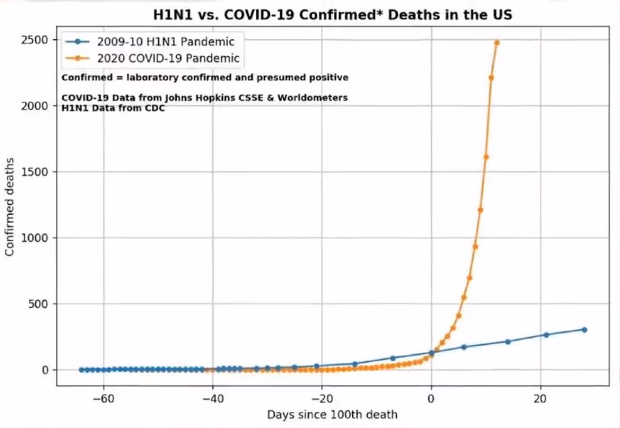 তা বুঝতে হলে রাজীবের ভিডিওয় দেখানো প্রথম গ্রাফ-টির দিকে তাকাতে হবে। এটি মার্কিন যুক্তরাষ্ট্রে এইচ১এন১ অর্থাৎ সোয়াইন ফ্লু-তে মৃত্যুর হার ও কোভিড-১৯ রোগে মৃত্যুর হারের একটি তুলনা। নীল রঙের রেখাটি দেখাচ্ছে দিন প্রতি সোয়াইন ফ্লুতে মৃত্যুর হার। আর হলুদ রেখা দেখাচ্ছে করোনাভাইরাসের ক্ষমতা। দুটি রেখা দেখলেই বোঝা যাচ্ছে করোনাভাইরাস ঠিক কতটা মারাত্বক।