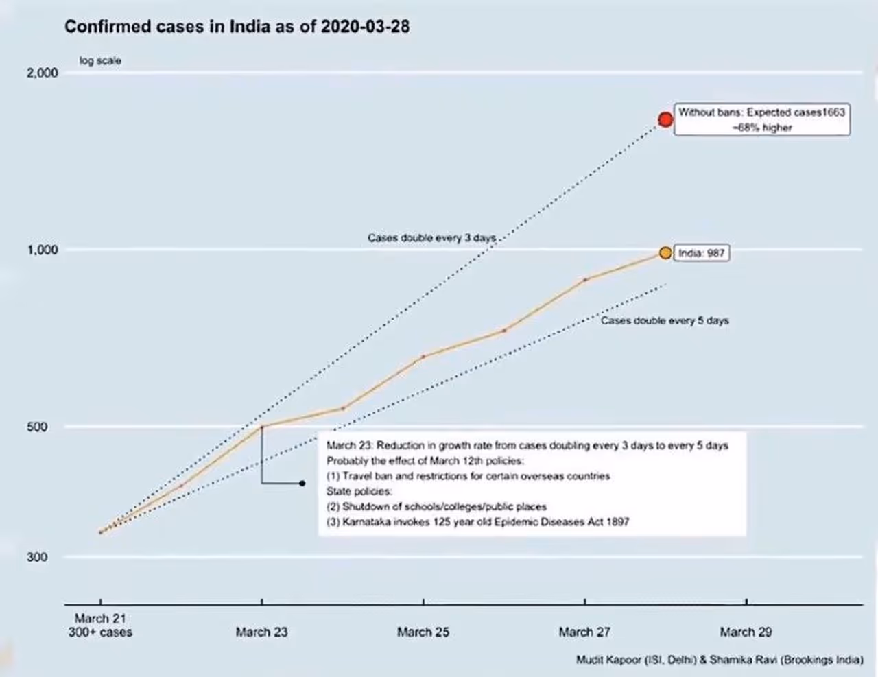 দ্বিতীয় গ্রাফটিতে, ভারতের লকডাউন-এর আগের ও পরের করোনাভাইরাস সংক্রমণের অবস্থাটা দেখানো হয়েছে। তাতে দেখা যাচ্ছে ২৩ মার্চ, অর্থাৎ লকডাউন জারির আগের দিন পর্যন্ত দারুণ দ্রুত হারে, বস্তুত দুইদিনে ৩০০ থেকে ভারতে আক্রান্তের সংখ্যা বেড়ে ৫০০-তে পৌঁছেছে। কিন্তু, লকডাউনের পরের দিন থেকেই ধীরে ধীরে গ্রাফের রেখাটির গতি কমেছে। থমকে থমকে পরের পাঁচদিনে সে প্রায় ১০০০-এ এসে পৌঁছেছে। আগের গতিতে চলতে থাকলে, কিন্তু এই সময়ে প্রায় ২০০০-এর কাছে পৌঁছে যাওয়ার কথা ছিল আক্রান্তের সংখ্যা। গ্রাফে দেখা যাচ্ছে প্রায় ৬৫ শতাংশ কমানো গিয়েছে সংক্রমণের গতি।