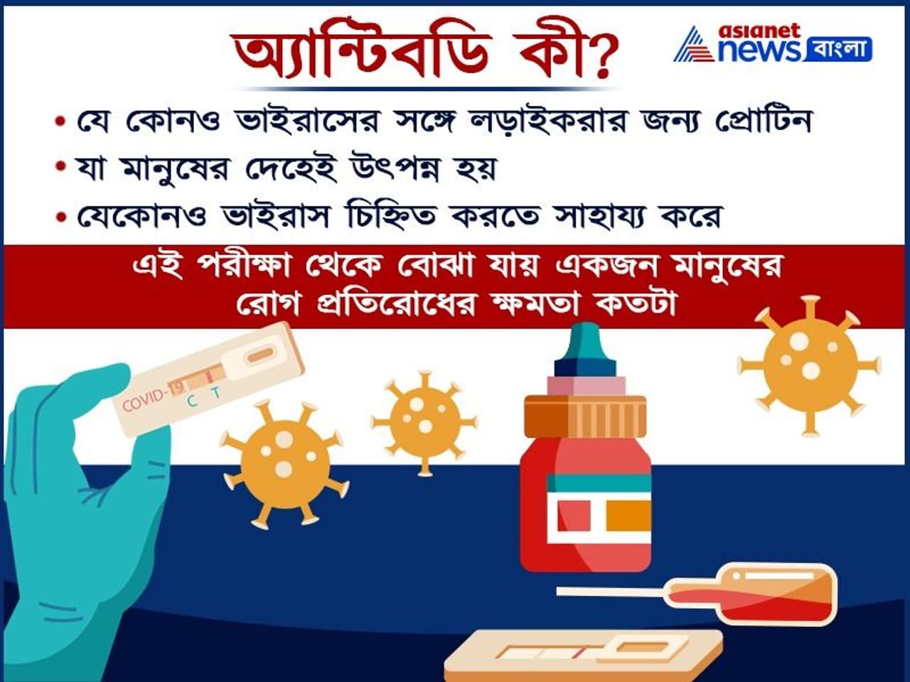 করোনাভাইরাসের কারণে অ্যান্টিবডি পরীক্ষা বাড়ছে অ্যান্টিবডি পরীক্ষায় ছাড়পত্র দিয়েছে আইসিএমআর অ্যান্টিবডি পরীক্ষা করোনা নির্ণয়ে ককটা সহায়ক অ্যান্টিবডি টেস্টের মূল উদ্দেশ্য একটি গোষ্ঠীর স্বাস্থ্য বিবেচনা করা