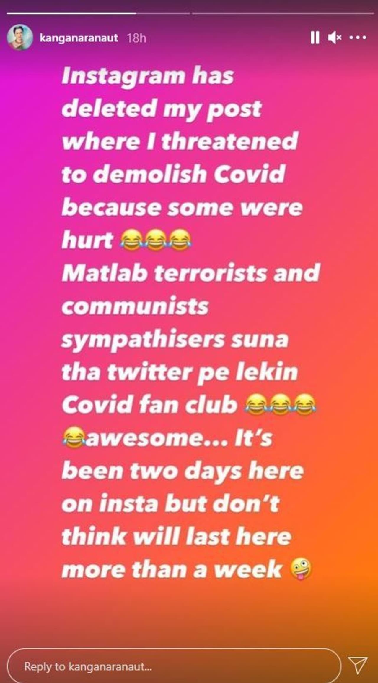 তাঁদের কাছে যদি এই বার্তা পৌঁছায় যে করোনা তেমন কিছু নয়, তবে এত মানুষের ধৈর্য্যের বাঁধ পলকে ভেঙে যাবে। সেই দিকে নজর দিয়েই এবার ইনস্টাগ্রাম কঙ্গনার কোভিড পোস্ট ডিলিট করে দিল। এর আগে কঙ্গনা ব্রাত্য হয়েছেন টুইটর থেকে। সাম্প্রদায়িকতা নিয়ে উষ্কানি মূলক পোস্ট করা মাত্রই টুইটর ডিলিট করে দেয় কঙ্গনার টুইটর অ্যাকাউন্ট।