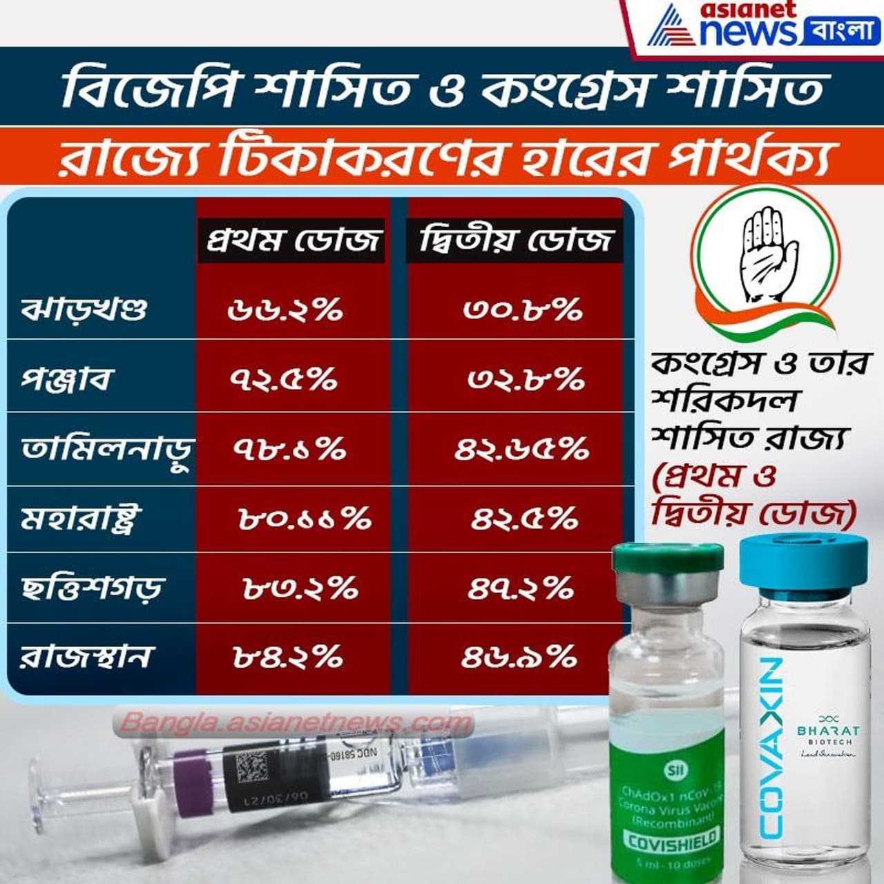 বিজেপি শাসিত ও কংগ্রেস শাসিত রাজ্যে টিকাকরণের হারের পার্থক্য বলে দিচ্ছে কীভাবে টিকাকরণের ক্ষেত্রে কাজ হয়েছে। কোন কোন রাজ্য কত পরিমাণ টিকা এখনও পর্যন্ত দিয়েছে, তা বিস্তারিত তথ্য তুলে ধরেছে ওই সমীক্ষা। জানা গিয়েছে ঝাড়খণ্ডে প্রথম ডোজ দেওয়া হয়েছে ৬৬.২% মানুষকে ও দ্বিতীয় ডোজ দেওয়া হয়েছে ৩০.৮% শতাংশকে। পঞ্জাবে ৭২.৫% শতাংশ মানুষ প্রথম ডোজ পেয়েছে। দ্বিতীয় ডোজ পেয়েছেন ৩২.৮% শতাংশ মানুষ।